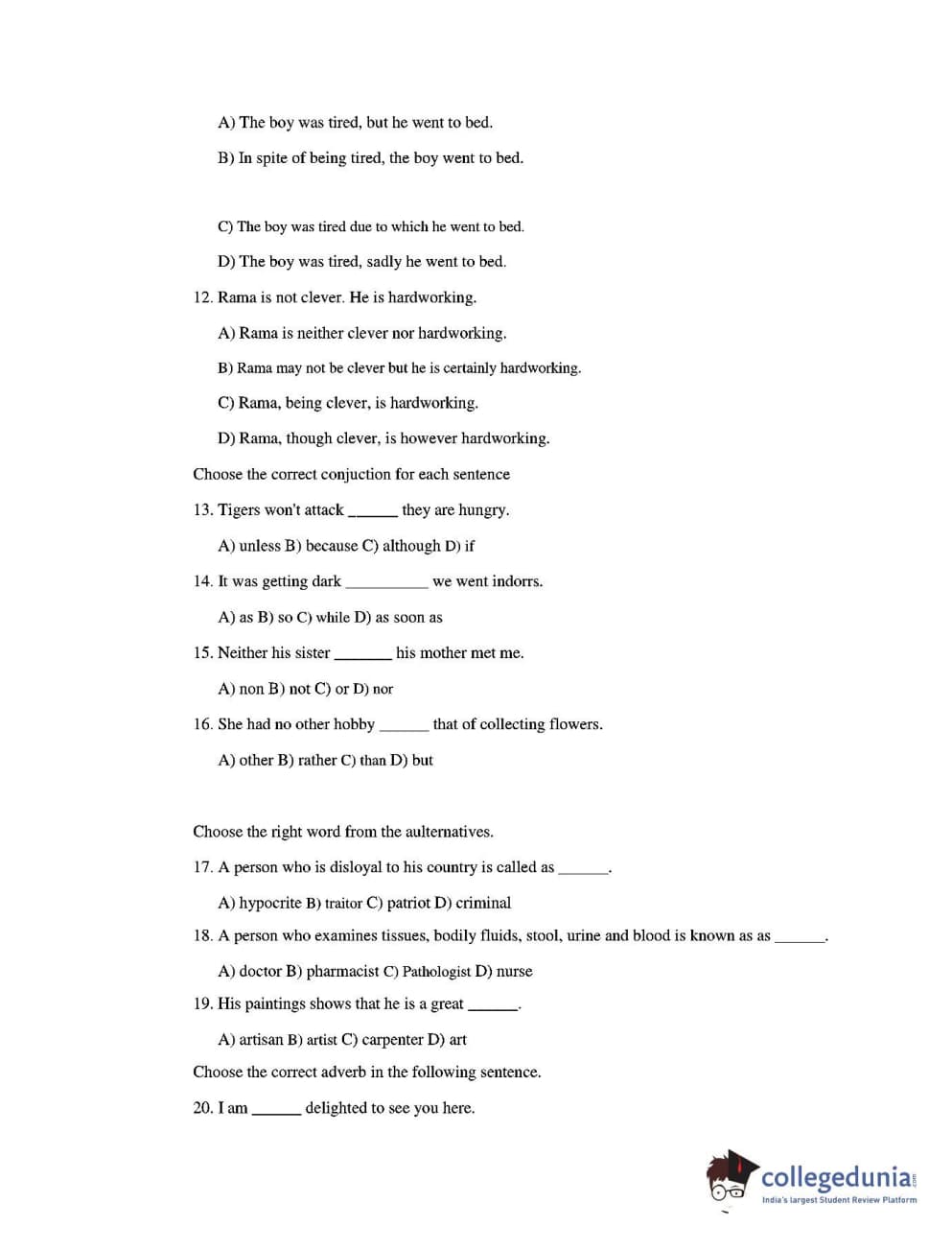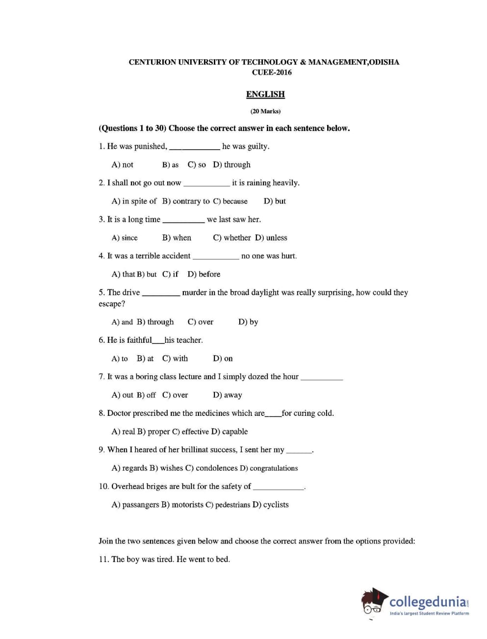 CUEE 2016 B.TECH ENGLISH SET-1 Question paper with answer key pdf is available for download. The exam was successfully organized by Chhattisgarh Professional Examination Board. The question paper comprised a total of 20 questions.