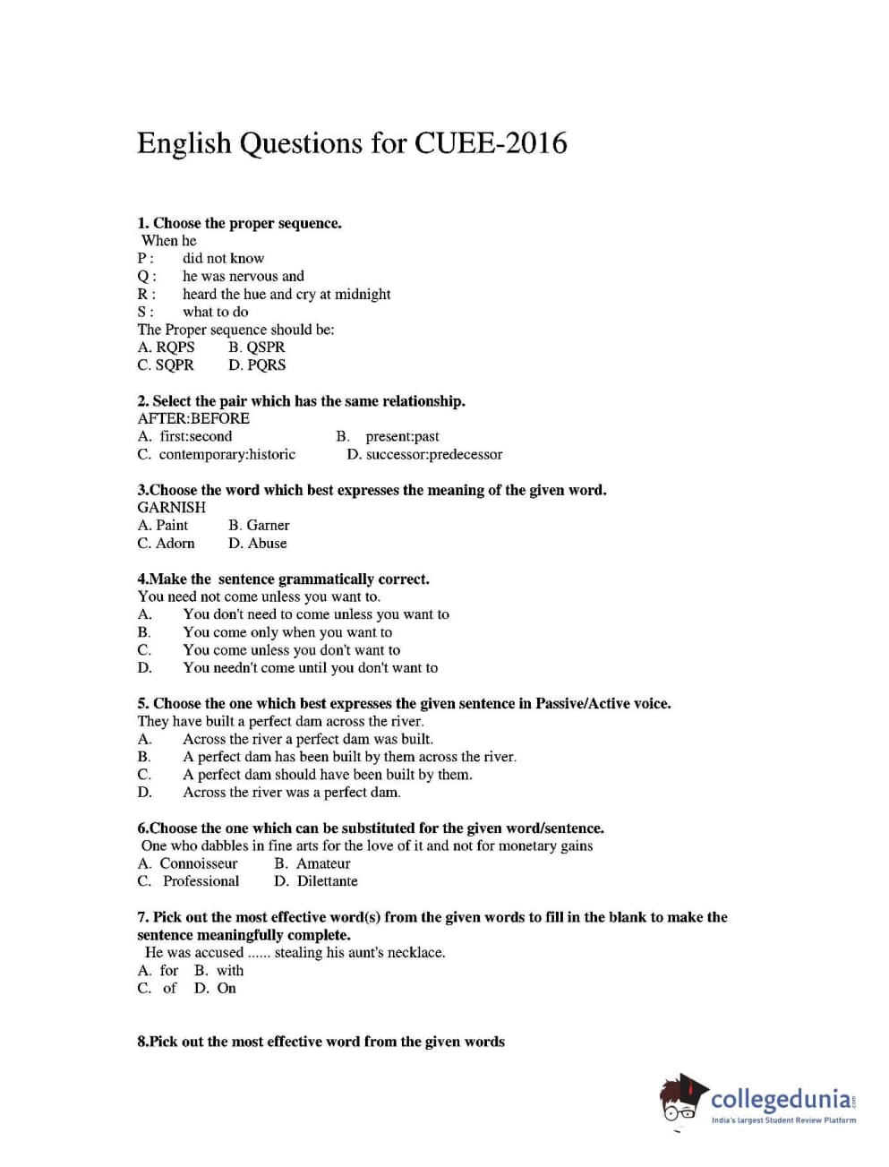 | CUEE 2016 B.TECH ENGLISH SET-5 Question Paper PDF | CUEE 2016 B.TECH ENGLISH SET-5 Answer Key PDF |