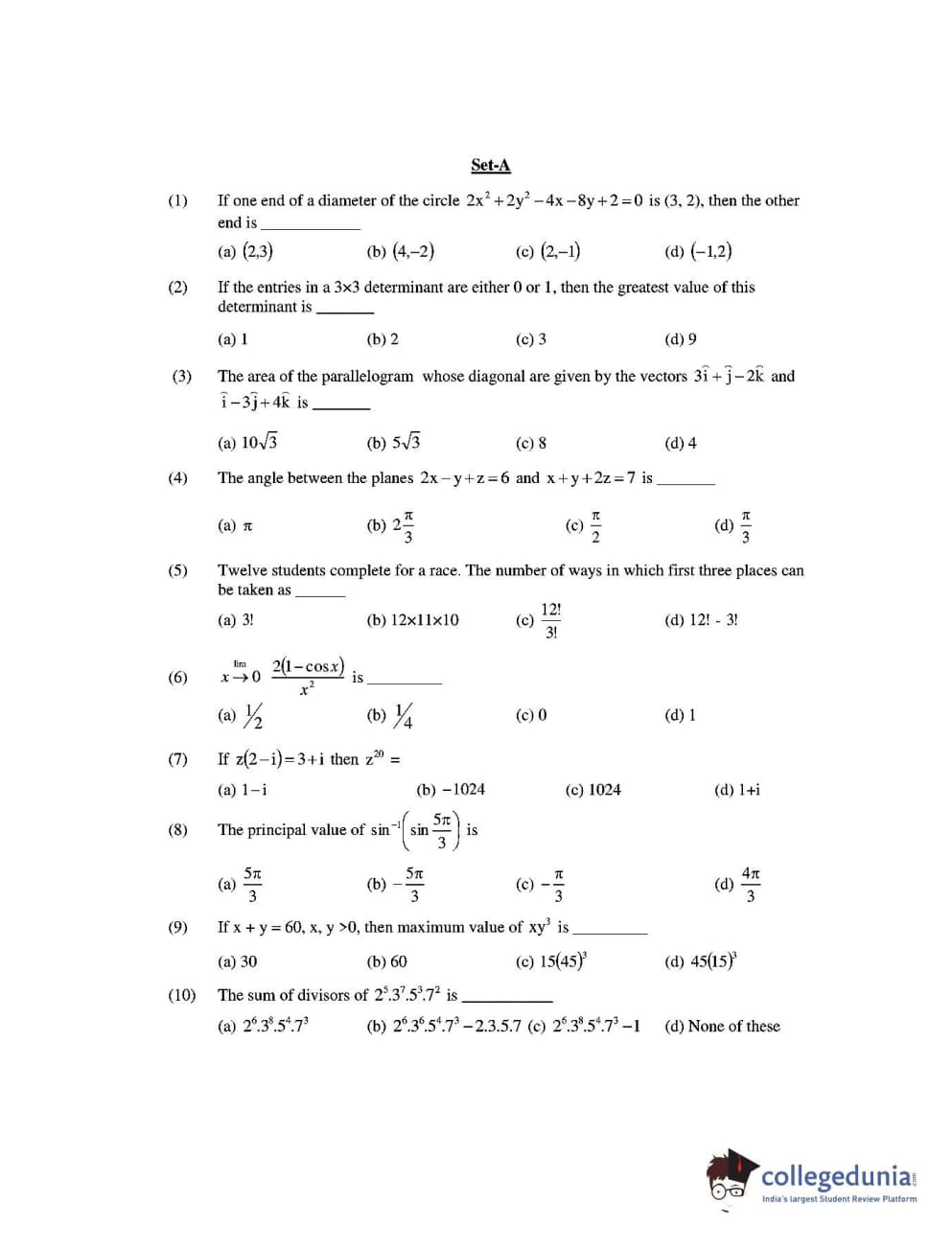 CUEE 2016 B.TECH MATHEMATICS SET-1 Question Paper with Answer Key PDFs