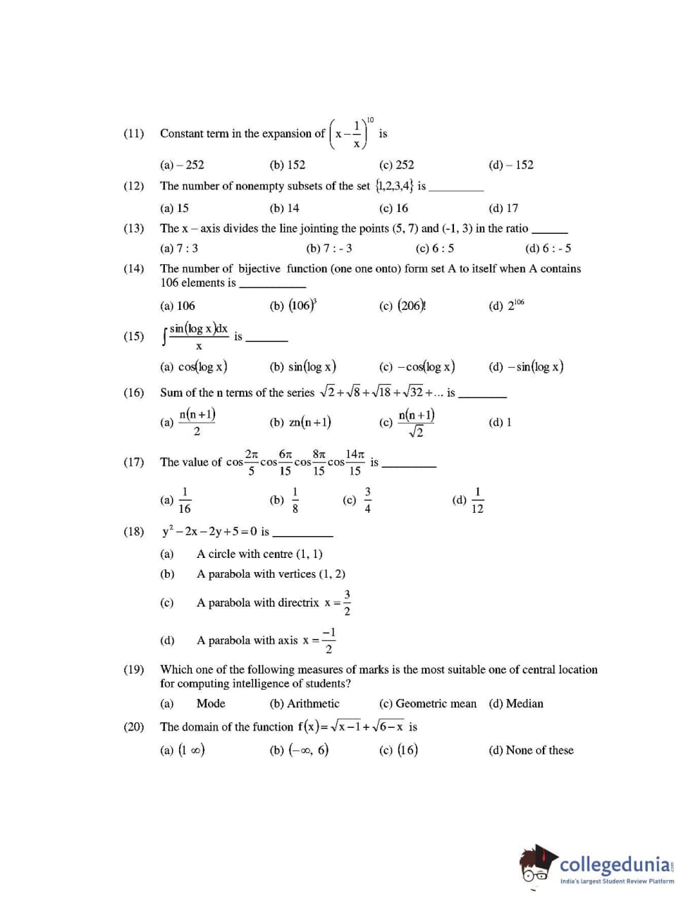 CUEE 2016 B.TECH MATHEMATICS SET-1 Question paper with answer key pdf is available for download. The exam was successfully organized by Chhattisgarh Professional Examination Board. The question paper comprised a total of 20 questions.