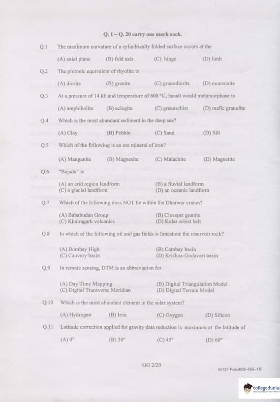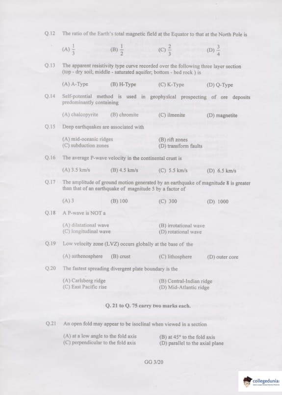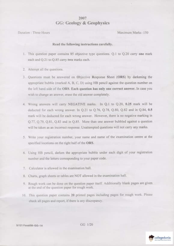 In GATE GG 2007, 85 questions were asked from Geology and Geophysics. Questions from 1 to 20 carried 1 mark each and Question number 21 to 85 carried 2 marks each. No negative markings are for question numbers 77, 79, 81, 83, and 85. Detailed information regarding the Question paper pattern of the GATE GG 2007 is given below: