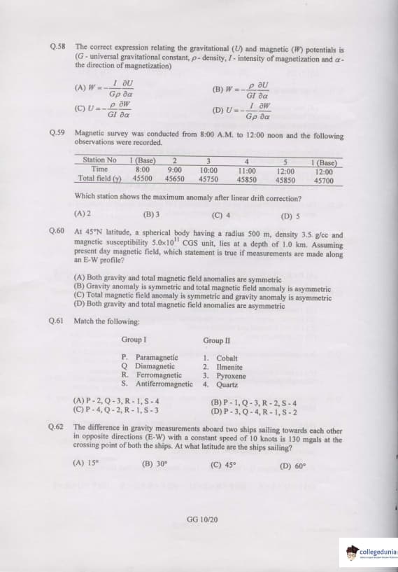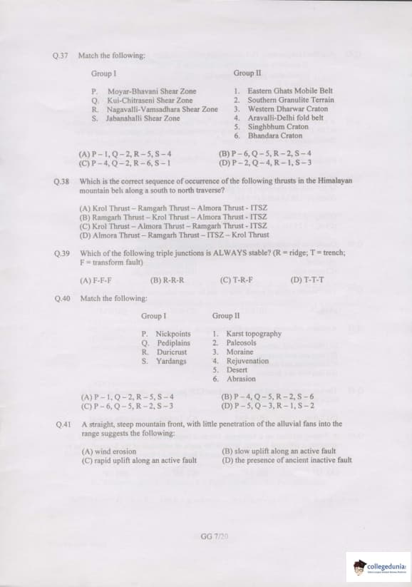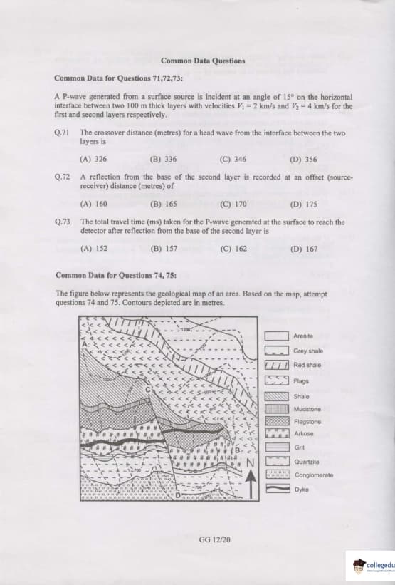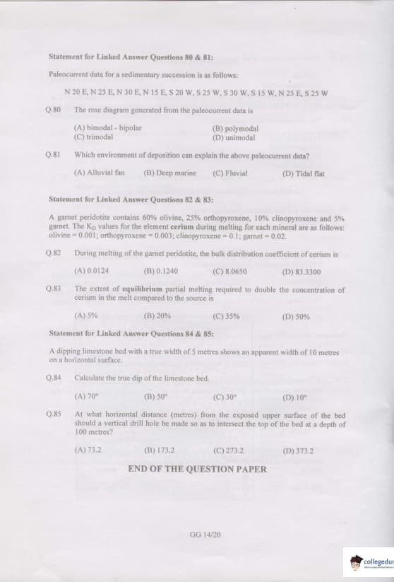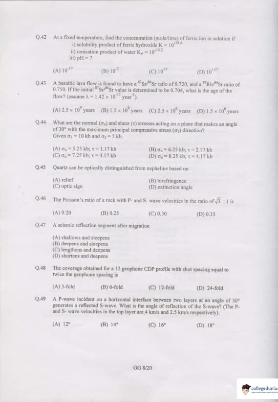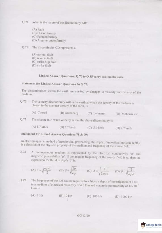 GATE 2007 Geology and Geophysics (GG) Question Paper with Answer Key PDFs are available for download.GATE 2007 Geology and Geophysics (GG) was conducted by IIT Kanpur on February 11, 2007. The paper consisted of 85 questions and was a 150 marks exam. GATE GG 2007 had direct questions related to Geology, Geophysics, etc. GATE GG 2007 was a three-hour duration exam. Objective Type Questions were asked in the question paper. GATE GG 2007 has questions of 1 and 2 marks and for every incorrect answer of 1 and 2 marks questions, 0.25 and 0.5 marks were deducted respectively.