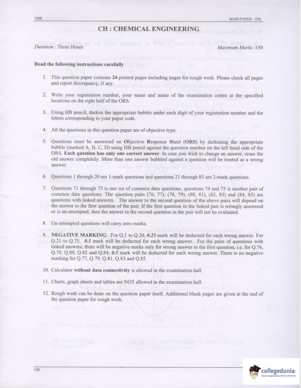 GATE 2008 Chemical Engineering (CH) Question Paper with Answer Key PDF is available for download. IISc Bangalore conducted GATE 2008 Chemical Engineering (CH) exam on February 10th. The overall difficulty level of paper was medium to difficult. GATE 2008 Chemical Engineering (CH) Question Paper included 85 MCQ questions with a weightage of 150 marks. All questions were from the Core Discipline- Chemical Engineering. There were no questions from the General Aptitude section, as in the recent year question papers (this is because General Aptitude section was included in 2010).