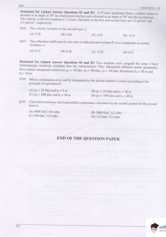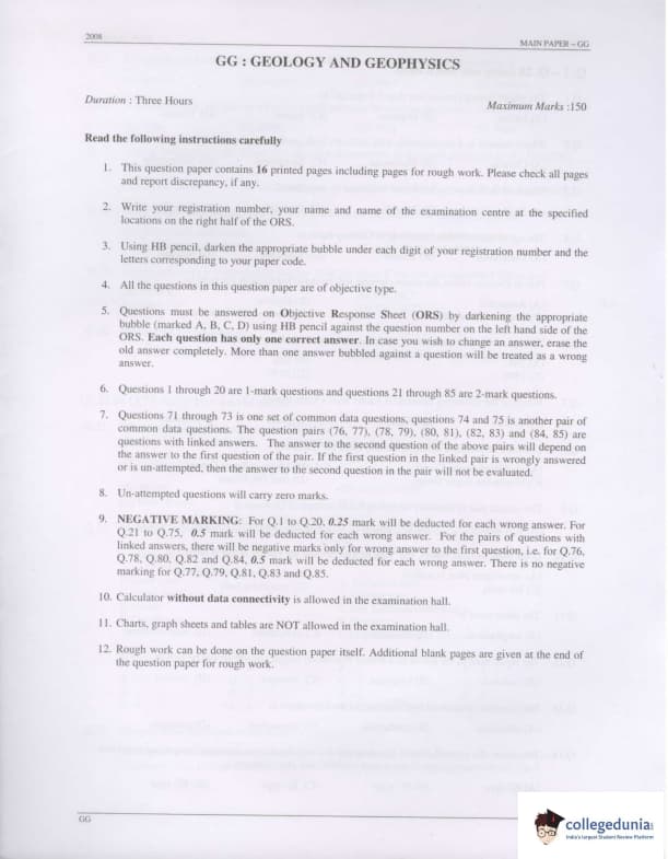 GATE 2008 GG Question Paper with Answer Key PDF is available for download. GATE 2008 exam conducting body was IISc Bangalore. GATE 2008 Geology and Geophysics (GG) paper was conducted on February 10, 2008. The question paper for GATE GG was rated moderate to difficult. The exam consisted of only 85 MCQs (Multiple Choice Question) and no NAT questions were asked. The paper was for a total of 150 marks.