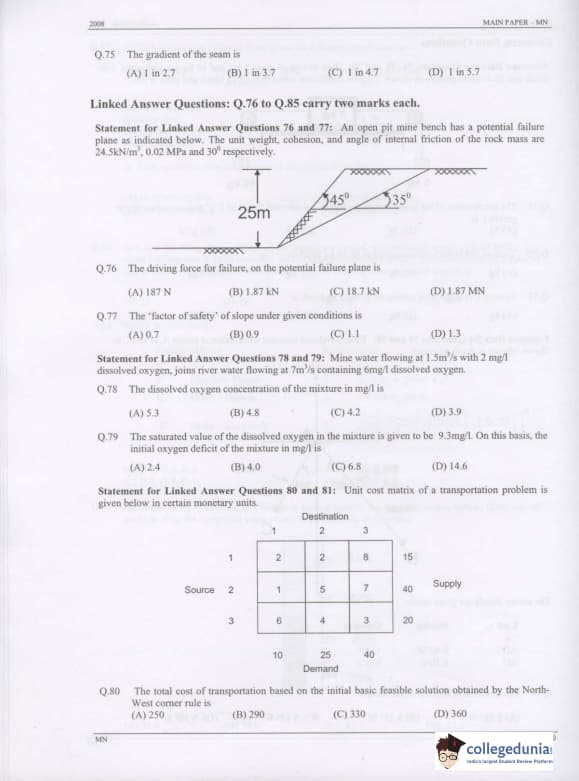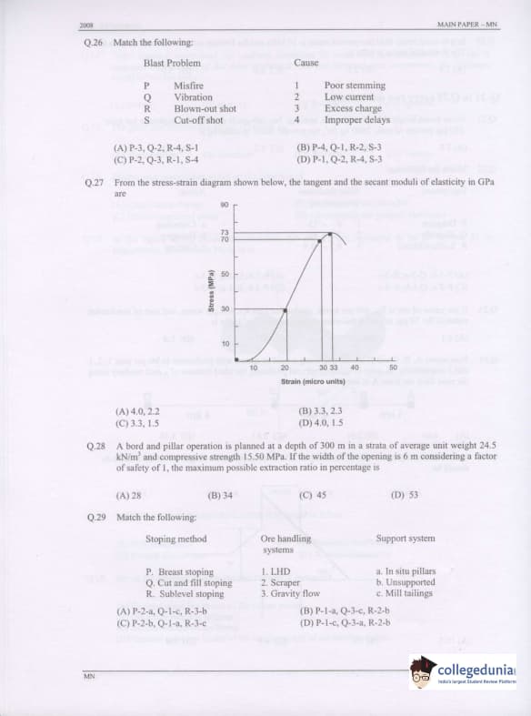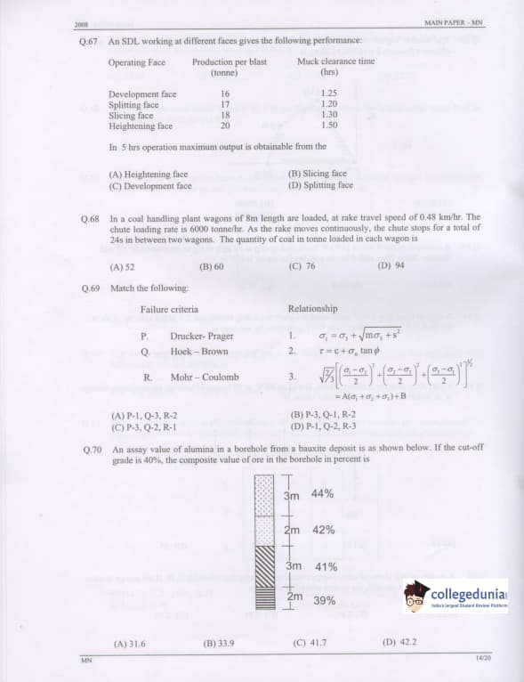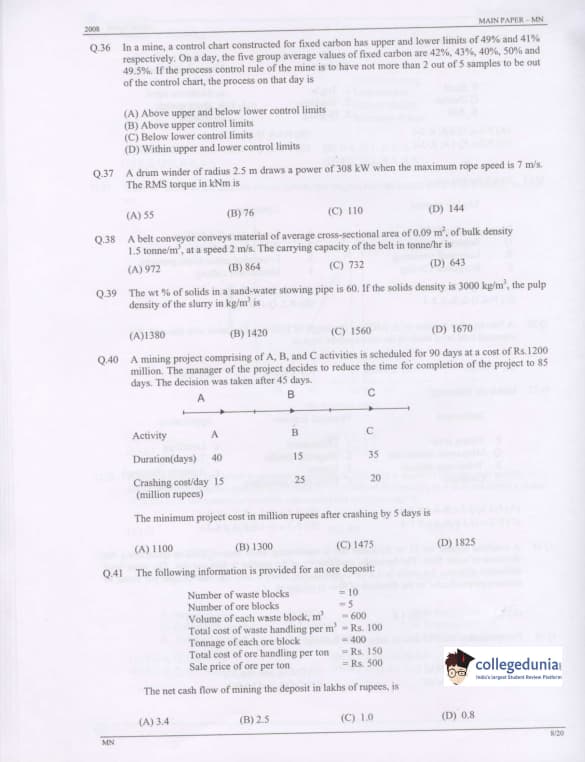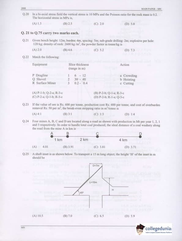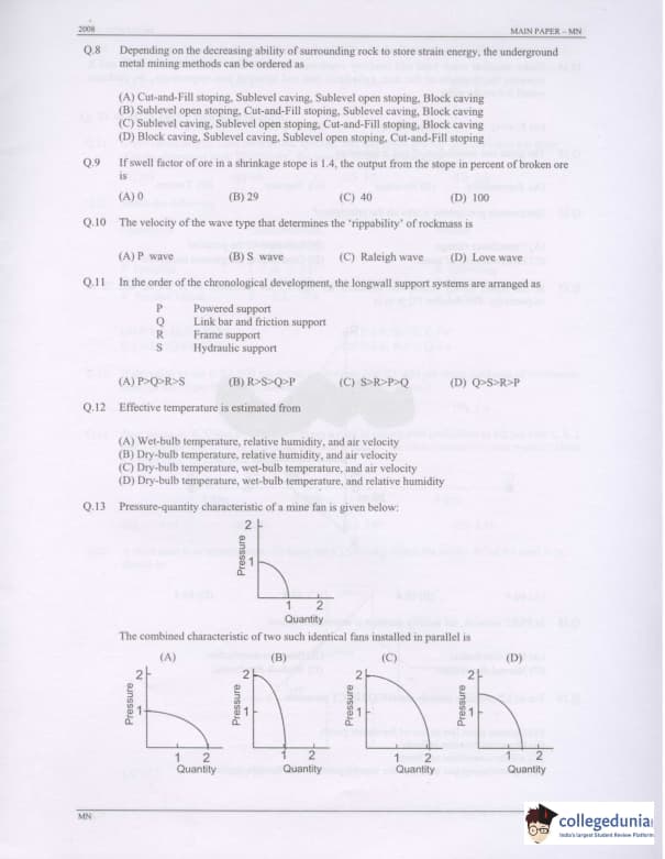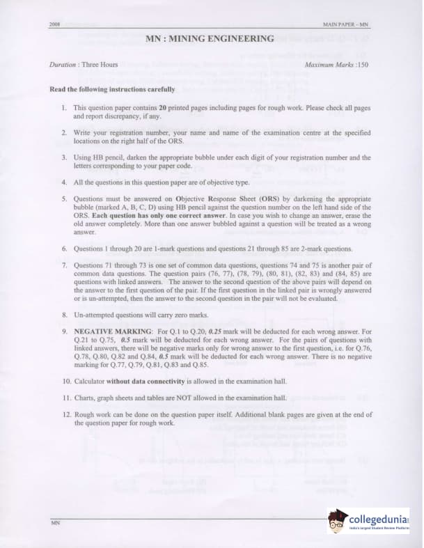 GATE 2008 Mining Engineering (MN) Question Paper with Answer Key pdf is available for download. The exam was conducted by IISc Bangalore on February 10 . The question paper comprised a total of 85 questions from General Aptitude and Mining Engineering (MN) topics.