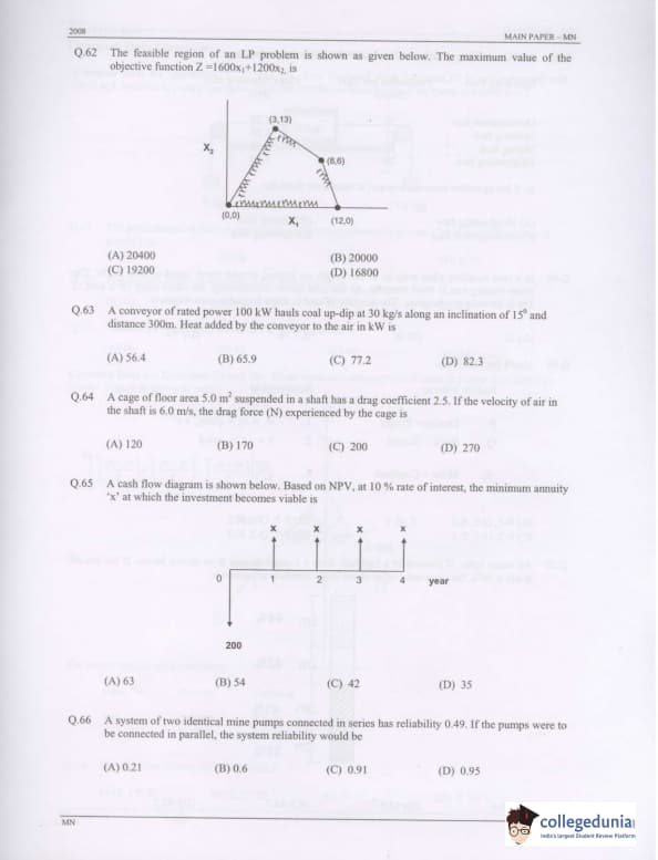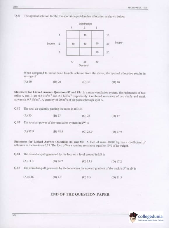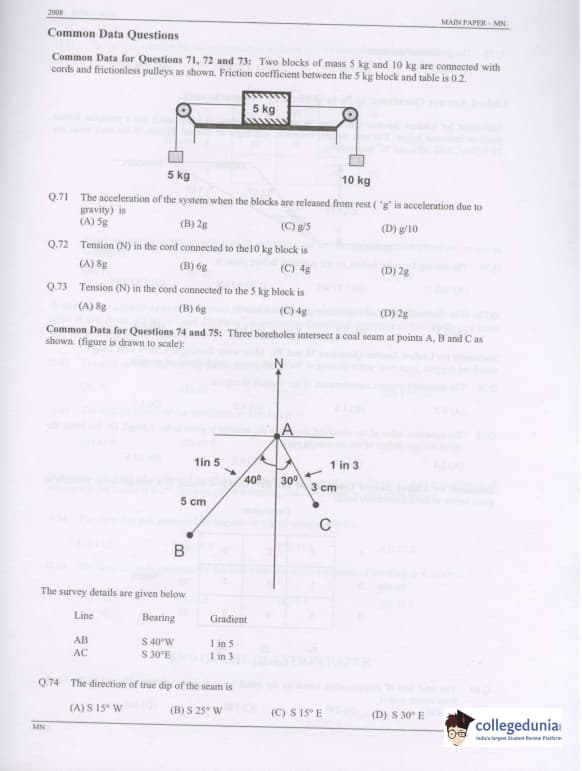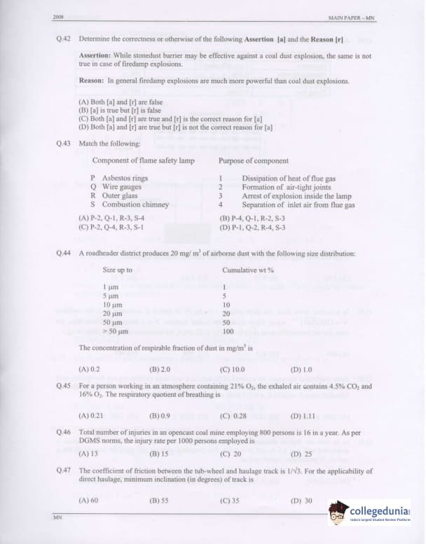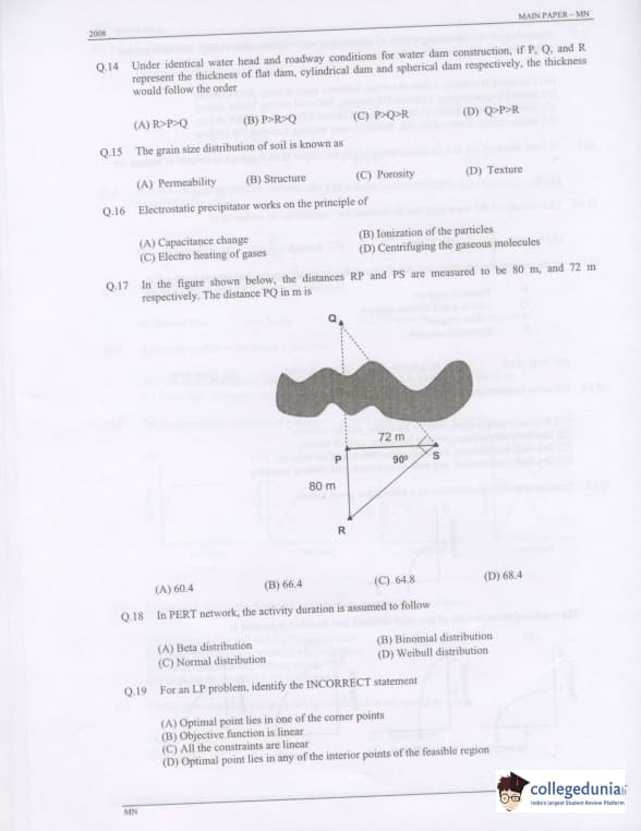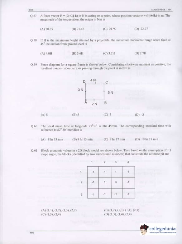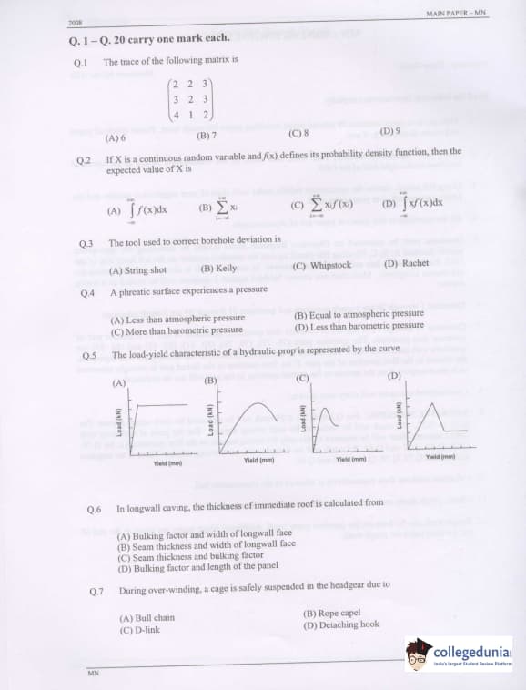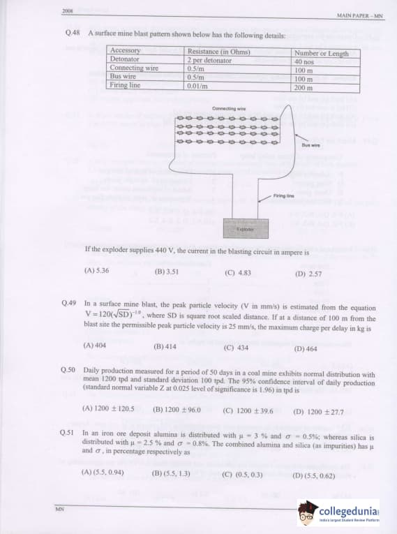 GATE 2008 Mining Engineering (MN) Question Paper with Answer Key pdf is available for download. The exam was conducted by IISc Bangalore on February 10 . The question paper comprised a total of 85 questions from General Aptitude and Mining Engineering (MN) topics.
