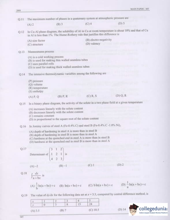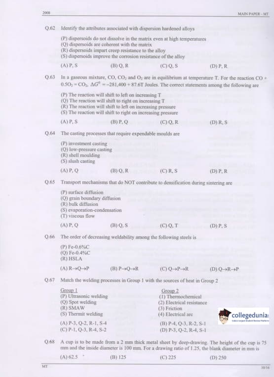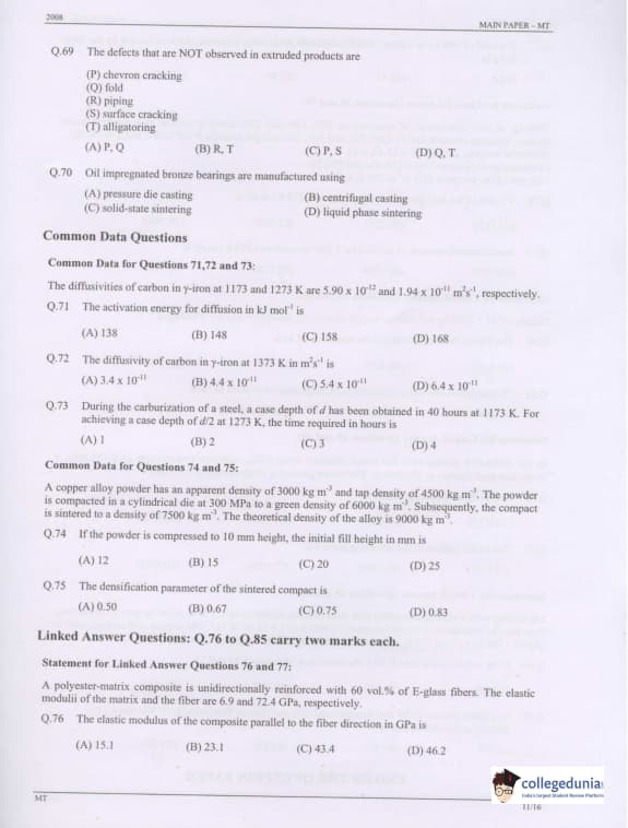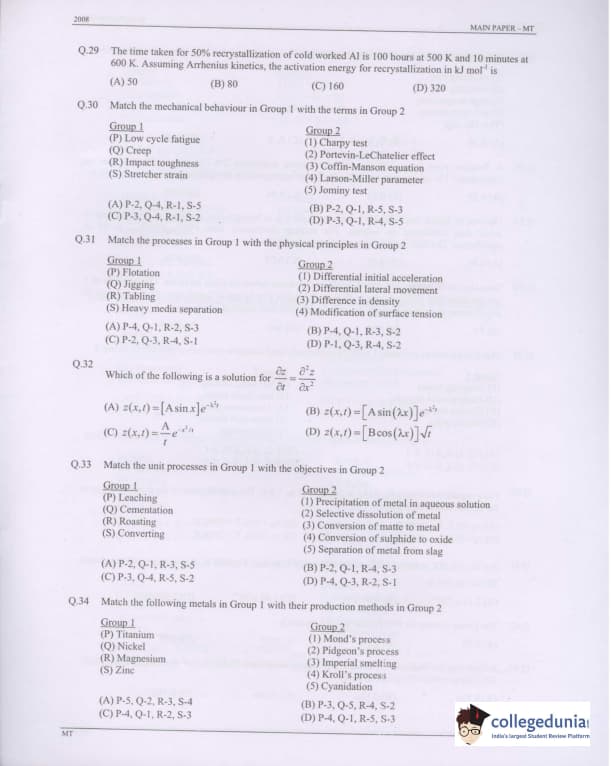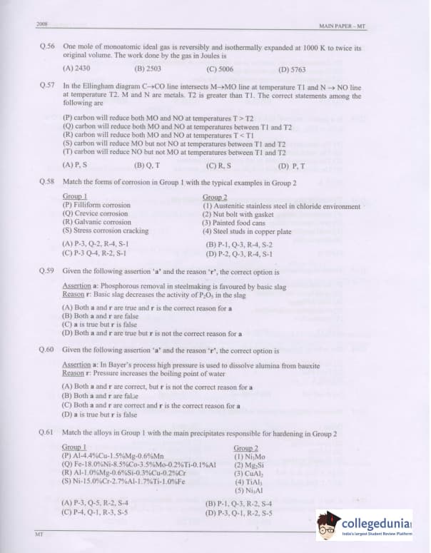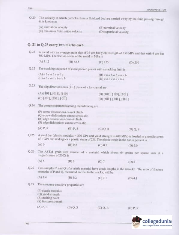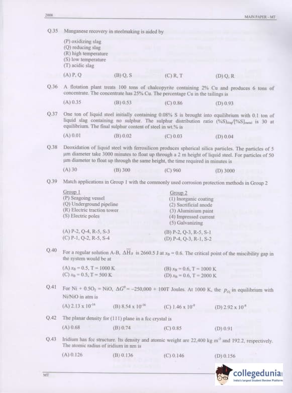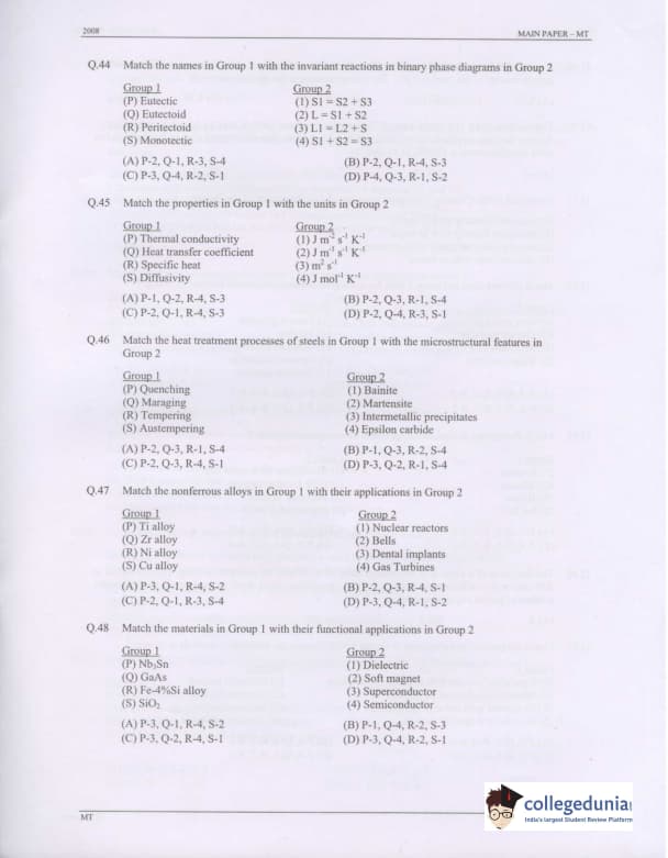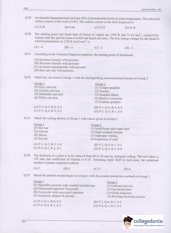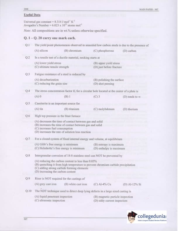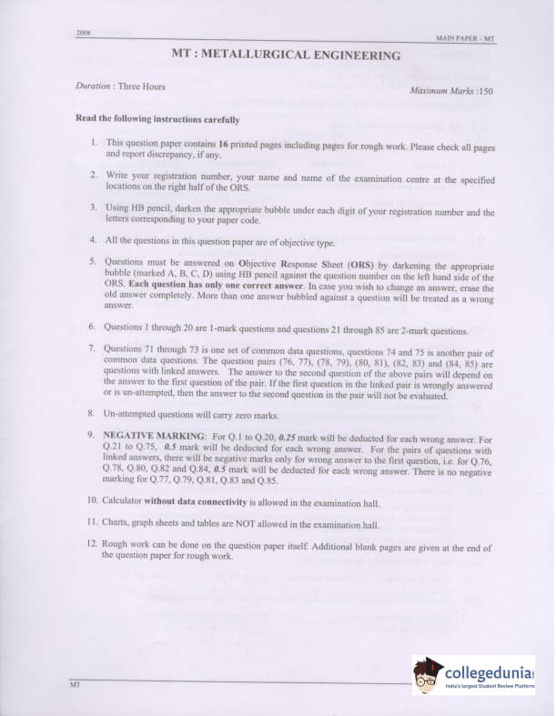 GATE 2008 Metallurgical Engineering (MT) Question Paper with Answer Key pdf is available for download. The exam was conducted by IISc Bangalore on February 10 . The question paper comprised a total of 85 questions from General Aptitude and Metallurgical Engineering (MT) topics.