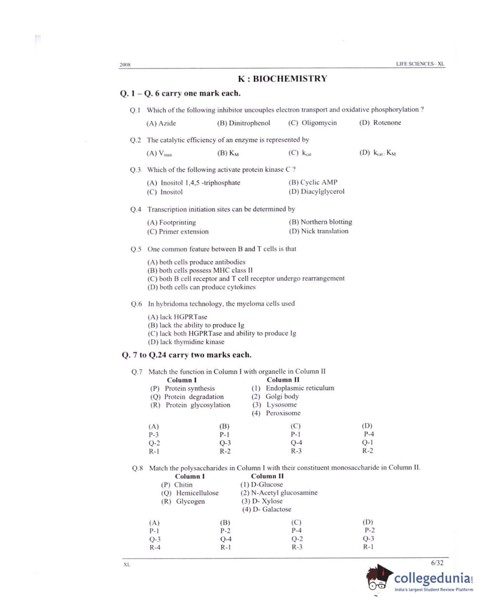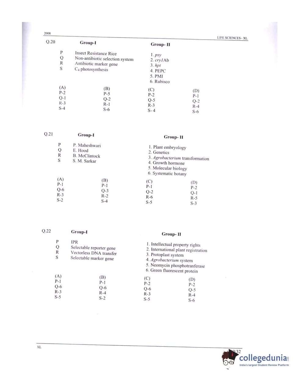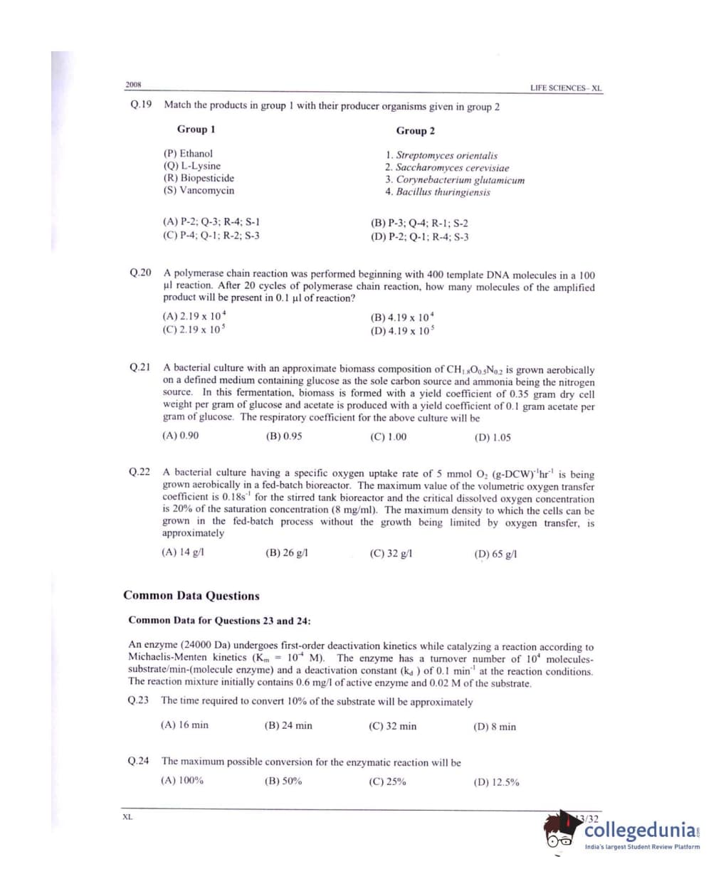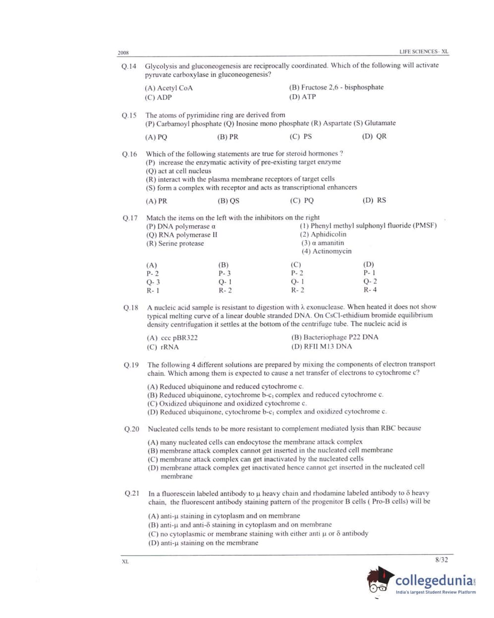 GATE 2008 Life Sciences (XL) Question Paper with Answer Key PDFs