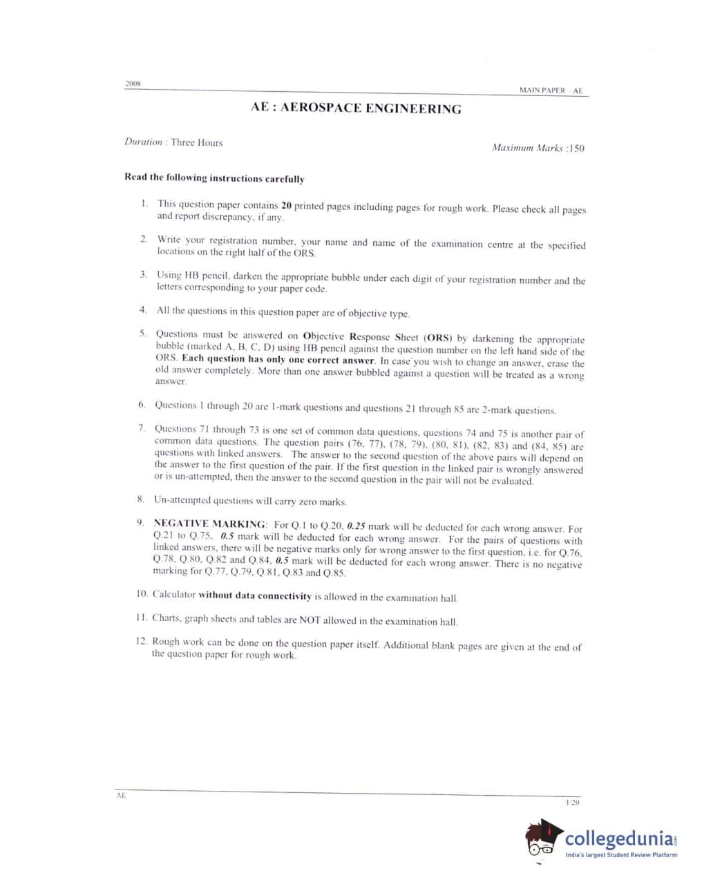 In GATE 2008 Aerospace Engineering (AE) paper, the questions were asked on core subjects such as Aerodynamics, Flight Mechanics, Propulsion, Structures, and Space Dynamics. The overall paper was for 150 marks with negative marking of 0.5 marks and 0.25 marks with respect to question type.