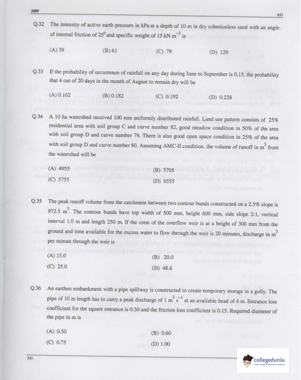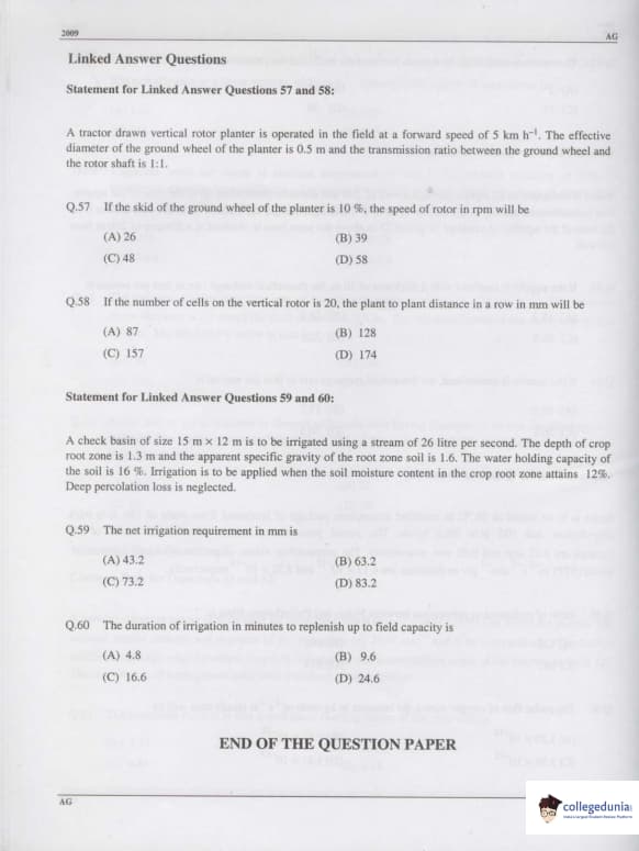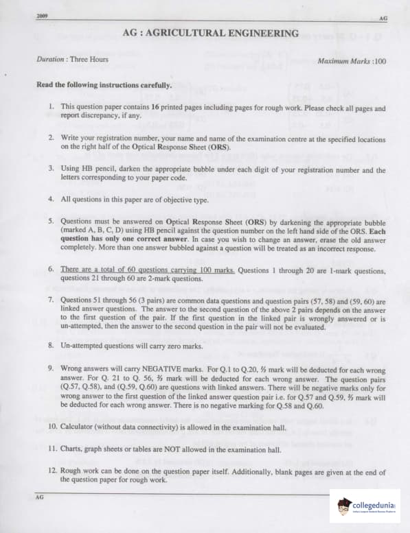 - GATE 2009 Agriculture Engineering Paper consisted of MCQ-type questions. The paper had 65 questions.