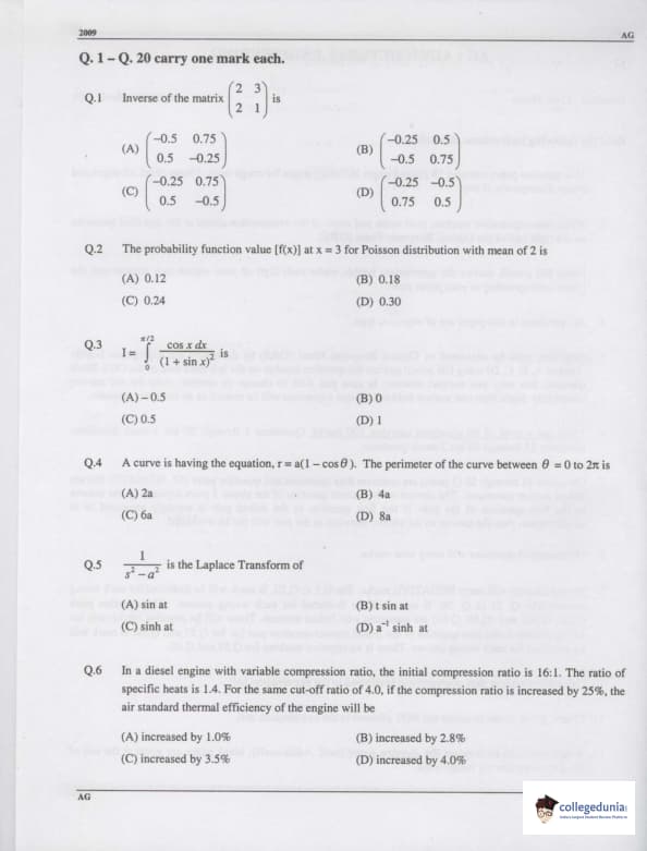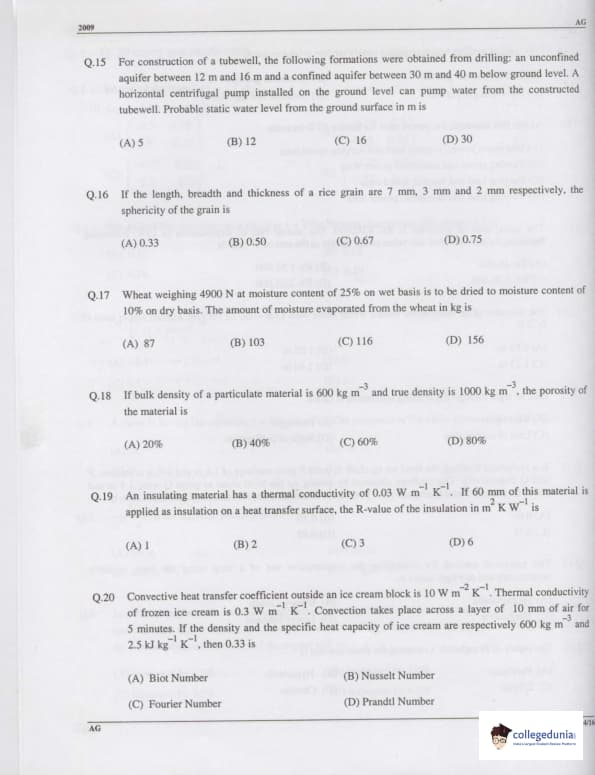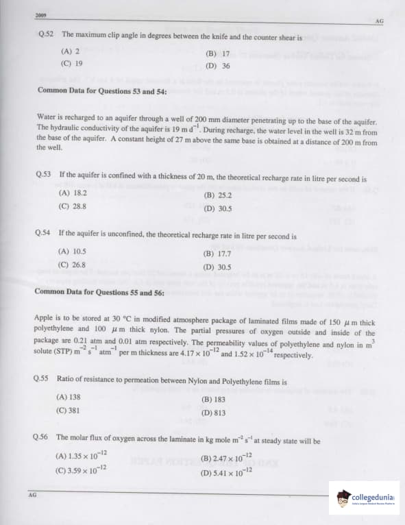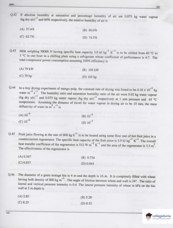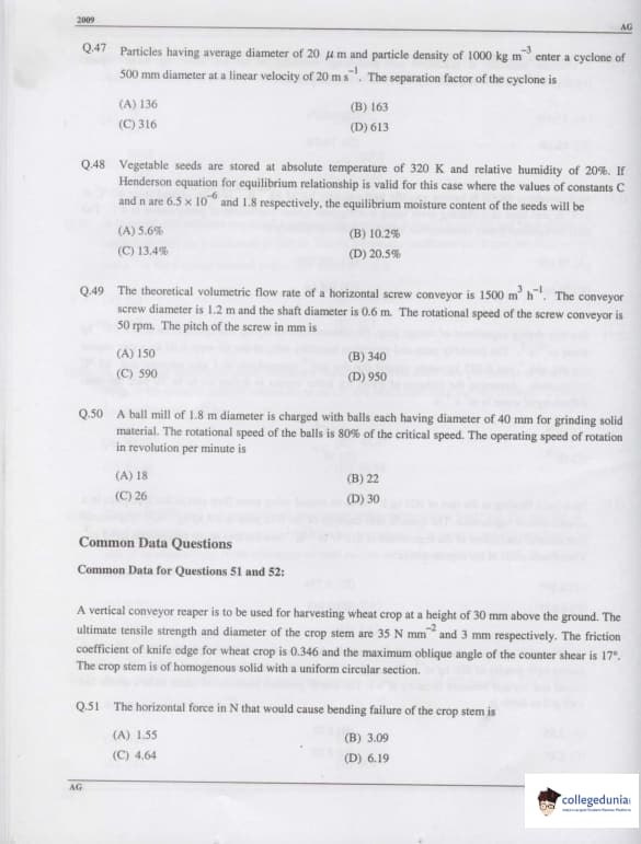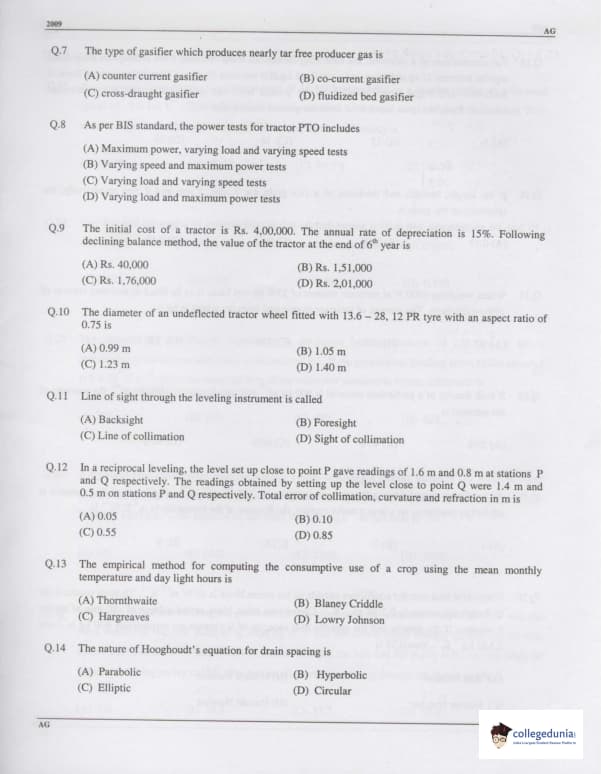 GATE 2009 Agricultural Engineering (AG) Question Paper with Answer Key PDFs (February 8 Forenoon Session)