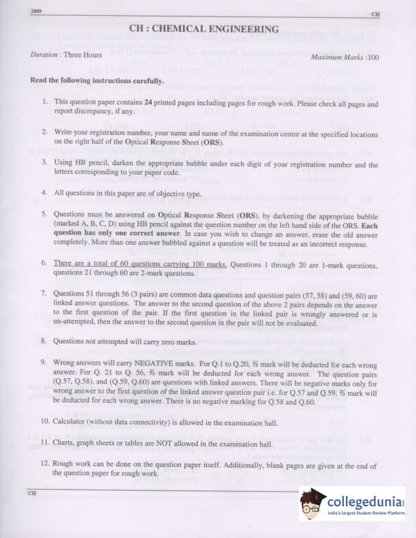 GATE 2009 CH Question Paper consisted of 60 questions. The question paper also carried negative marking of 1/3rd marks for every question of 1 mark and 2/3rd marks for every question of 2 marks. The 4 questions amongst them have linked answer type questions which were found in 2 pairs and another set of 4 questions of 2 pairs were found in the format of common data type questions.