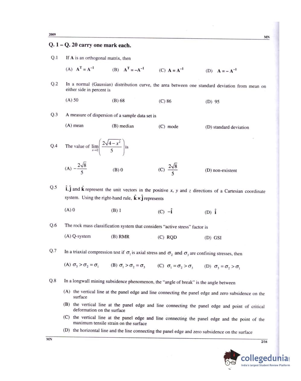 GATE 2009 Mining Engineering (MN) Question Paper with Answer Key pdf is available for download. The exam was conducted by IIT Roorkee on Feb-08 in the Forenoon Session. The question paper comprised a total of 60 questions from General Aptitude and Mining Engineering (MN) topics.