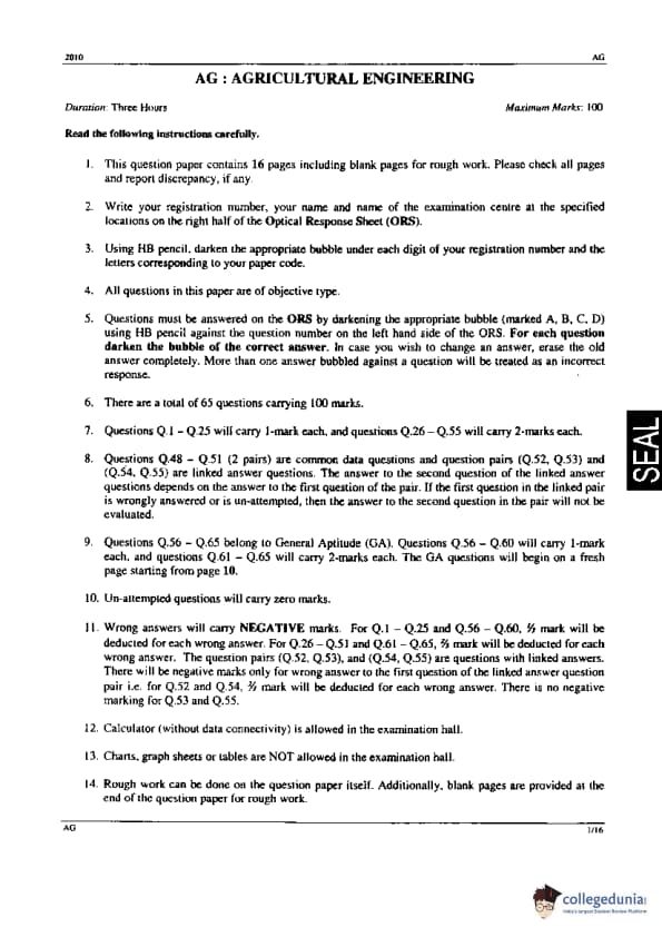 GATE 2010 AG Question Paper with Answer Key PDF is available for download. Indian Institute of Technology (IIT) Guwahati was responsible for conducting GATE 2010 Agricultural Engineering (AG) exam. The exam was conducted on 14th February 2010 from 9:00 am to 12:00 pm. The duration of the exam was for three hours and the students had to attempt the questions in the Optical Response Sheet (ORS). There were a total of 65 questions out of which 55 were core subject-specific and the remaining 10 belonged to general aptitude. All the questions were MCQs with some direct questions and some in the form of Linked Answer Type questions. The overall difficulty level was remarked as moderate by the students who took GATE 2010 AG question paper.