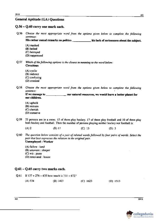 | GATE 2010 AG Question Paper | GATE 2010 AG Answer Key |