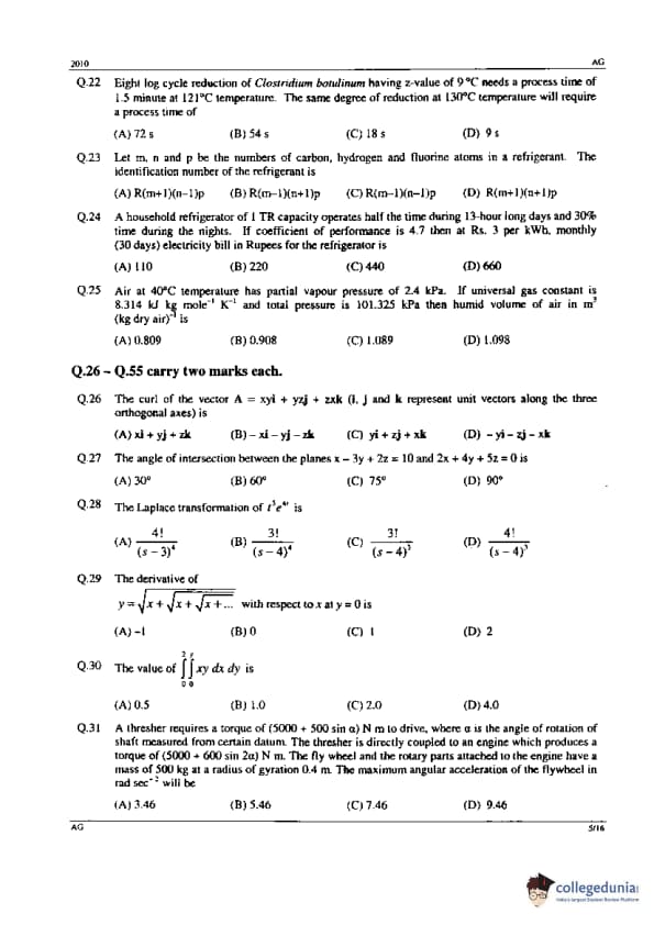 GATE 2010 AG Question Paper with Answer Key PDFs - February 14, 2010 (Forenoon Session)