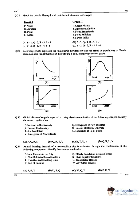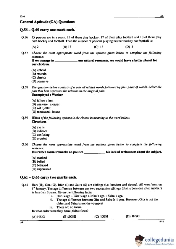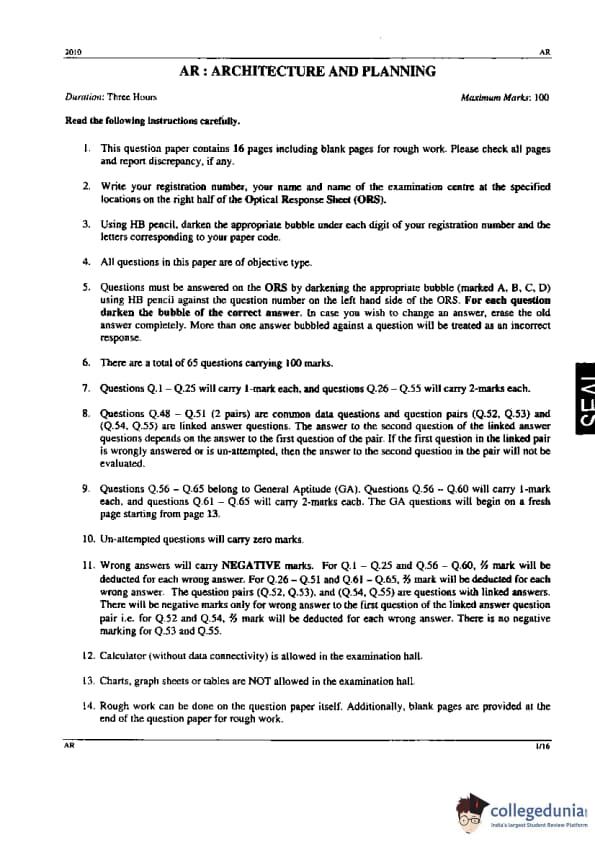 GATE 2010 AR Question Paper with Answer Key PDF is available for download. The exam was held on February 14, 2010, in the forenoon session (9 am to 12 pm) at multiple test centers across the country. GATE 2010 Architecture and Planning (AR) exam was conducted by the Indian Institute of Technology (IIT) Guwahati. Students reported the exam to be quite difficult with only a few questions from the core subject being moderate. GATE 2010 AR question paper was divided into two sections- the first one on the core subject containing 55 questions of 1 mark & 2 marks and the second one on General Aptitude comprising a total of 10 questions.