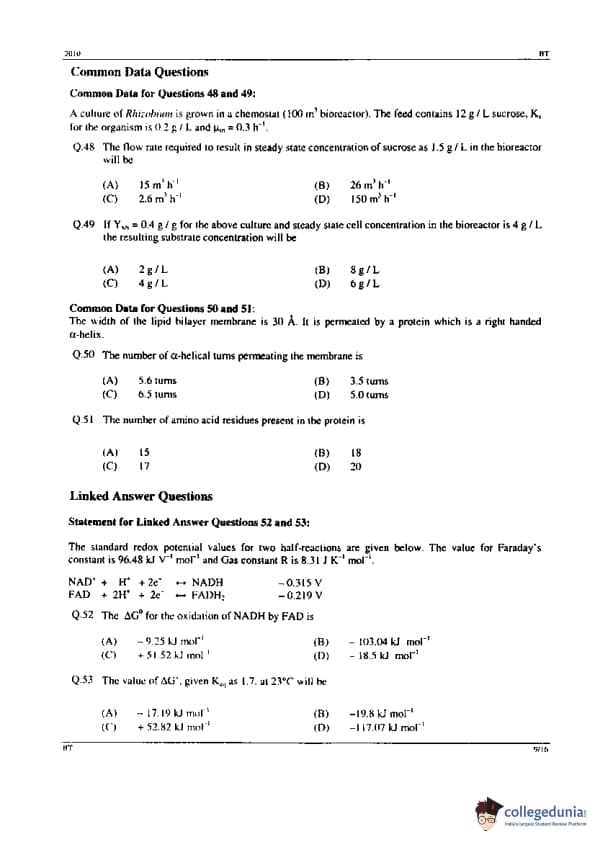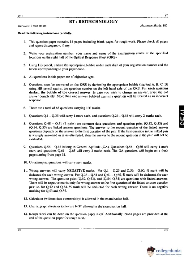 GATE 2010 BT Question Paper with Answer Key PDF is available for download. The exam took place in an offline mode wherein the students had to mark the answers in the optical response sheet. It was held on February 14, 2010 in the forenoon session by IIT Guwahati. The maximum marks of GATE 2010 BT question paper were 100. Out of 100, 15 marks were contributed by the 10 questions in the general aptitude section. The remaining 85 marks were carried by the 55 questions from the core subject of biotechnology. All the questions were in the form of Multiple Choices Questions (MCQs).
