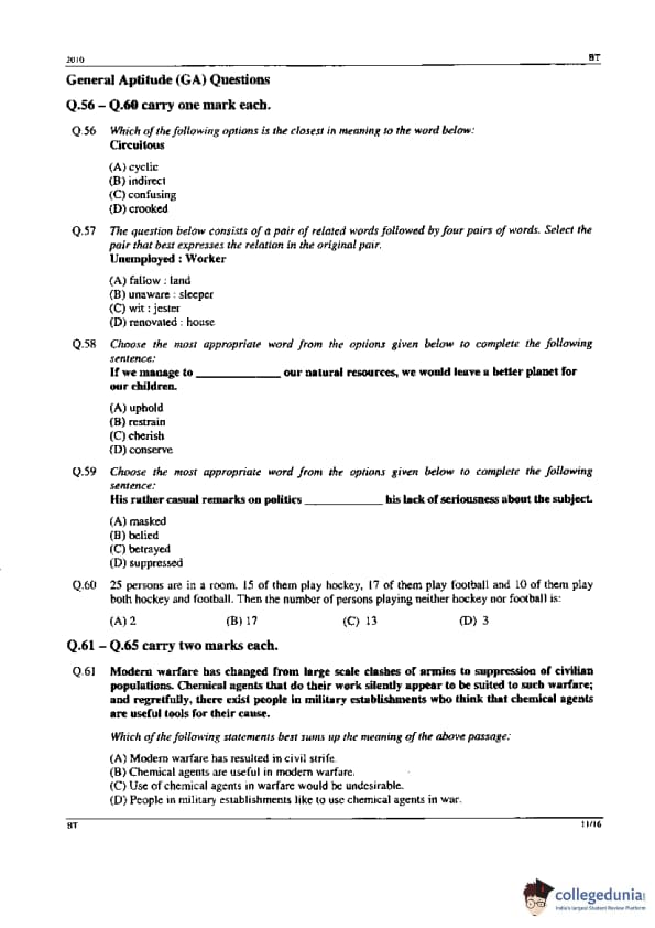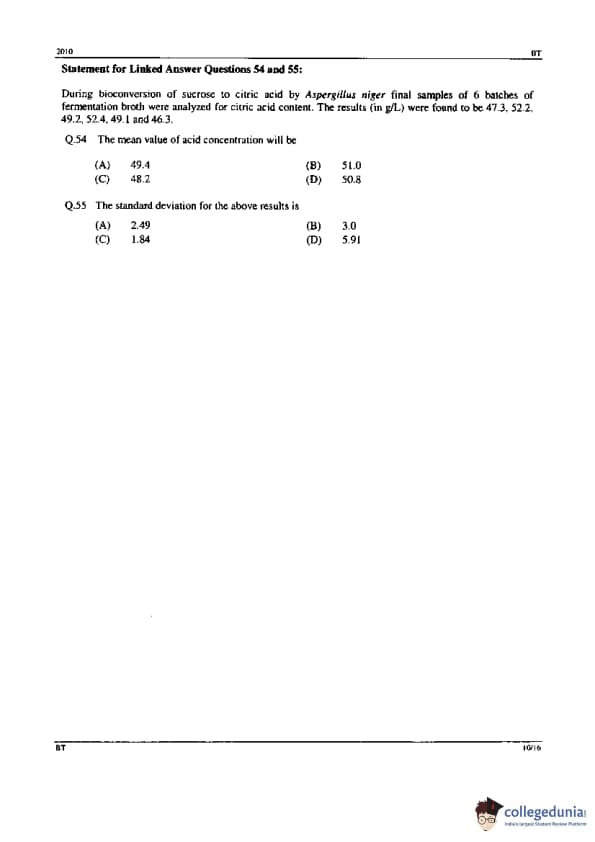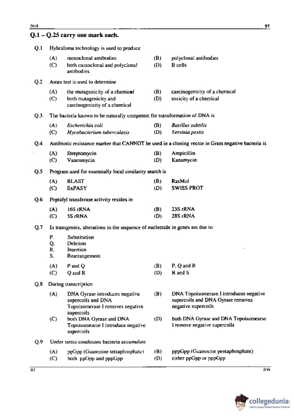 | GATE 2010 BT Question Paper | GATE 2010 BT Answer Key |