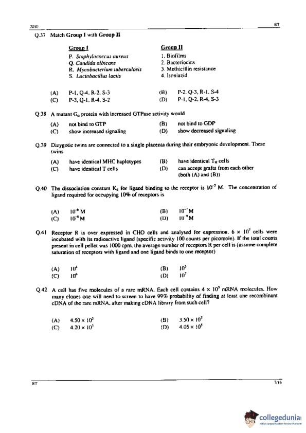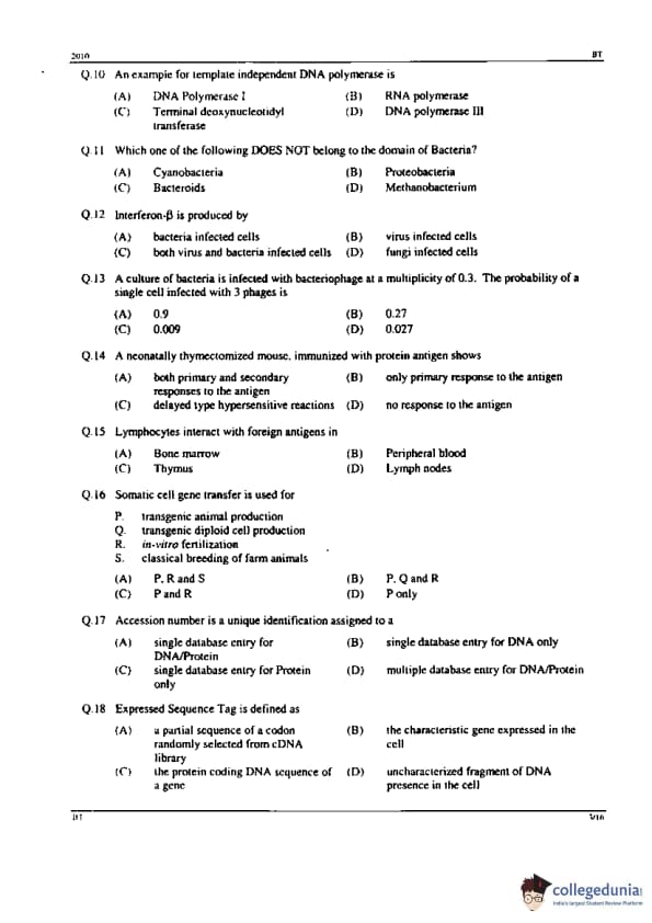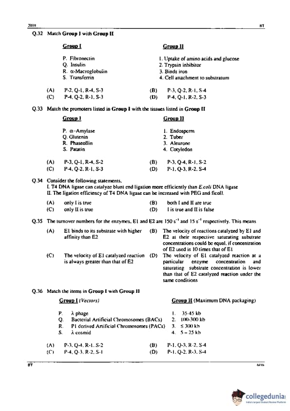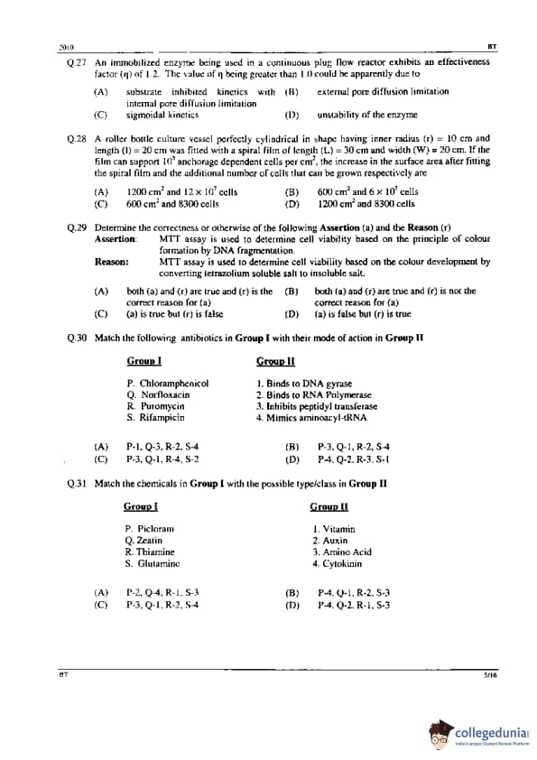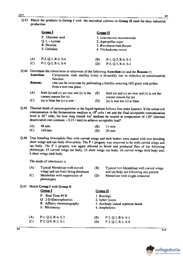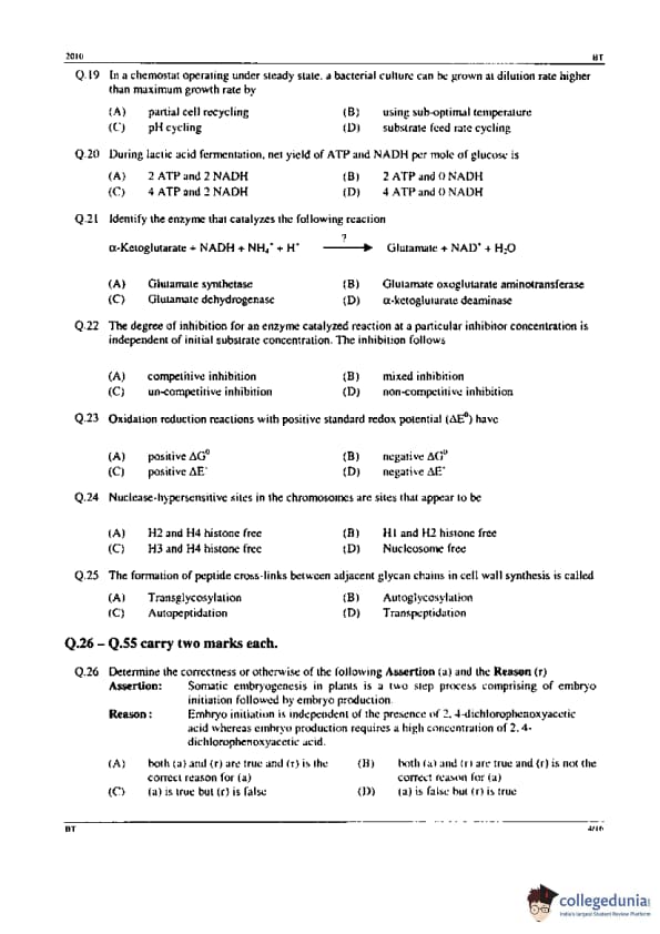 GATE 2010 BT Question Paper with Answer Key PDFs - February 14, 2010 (Forenoon Session)