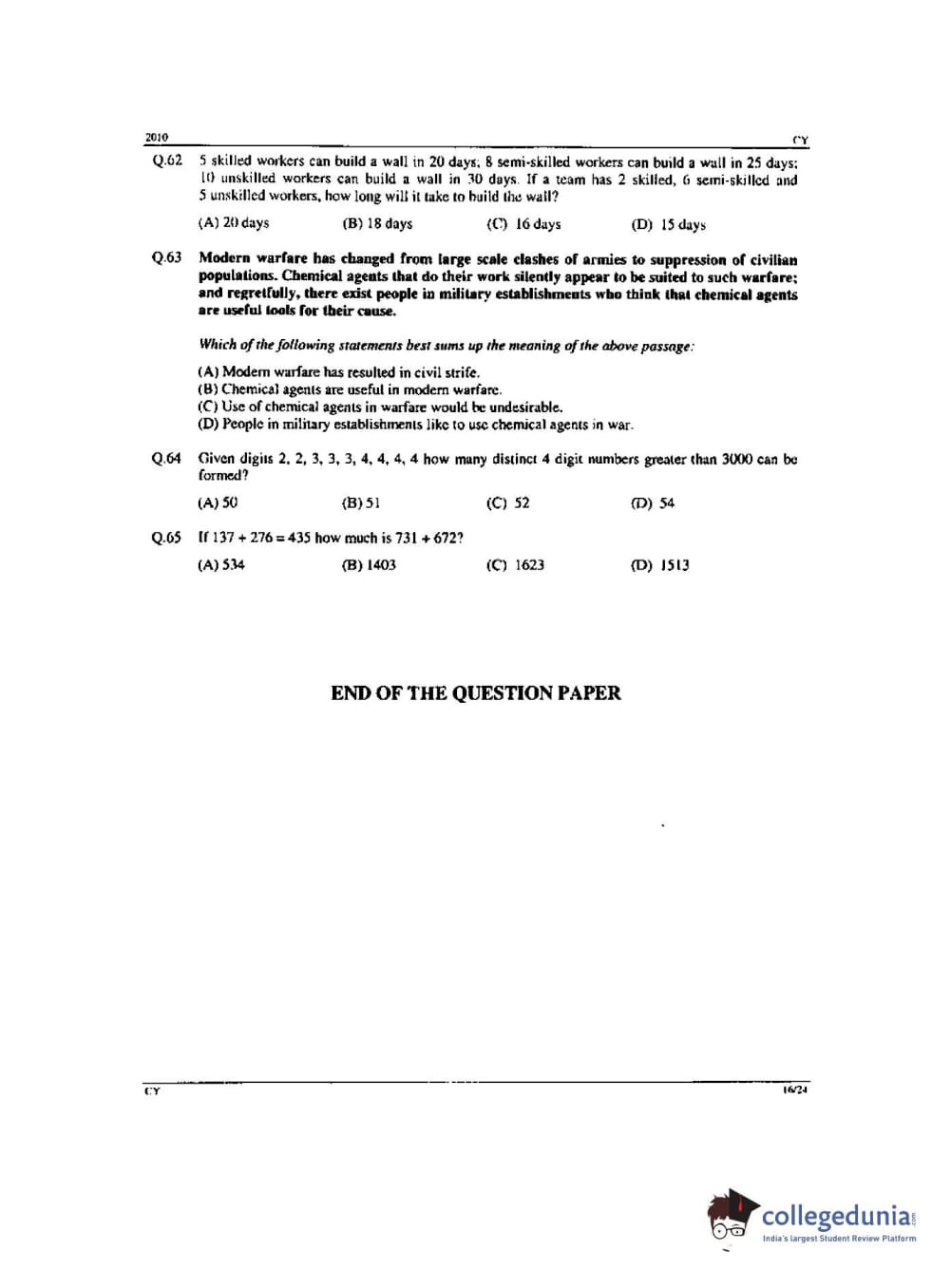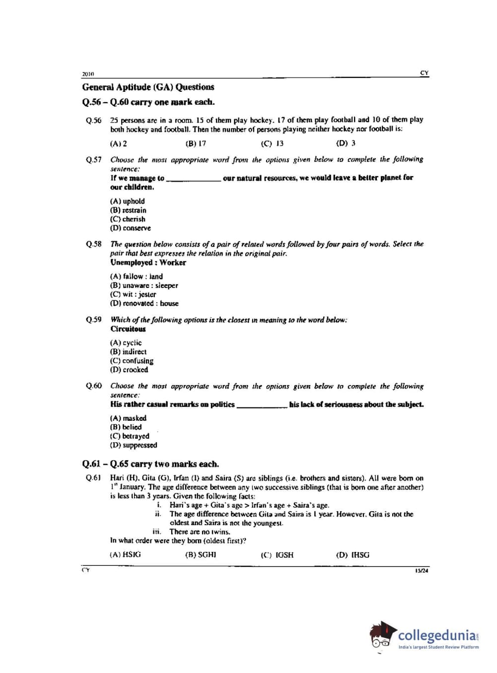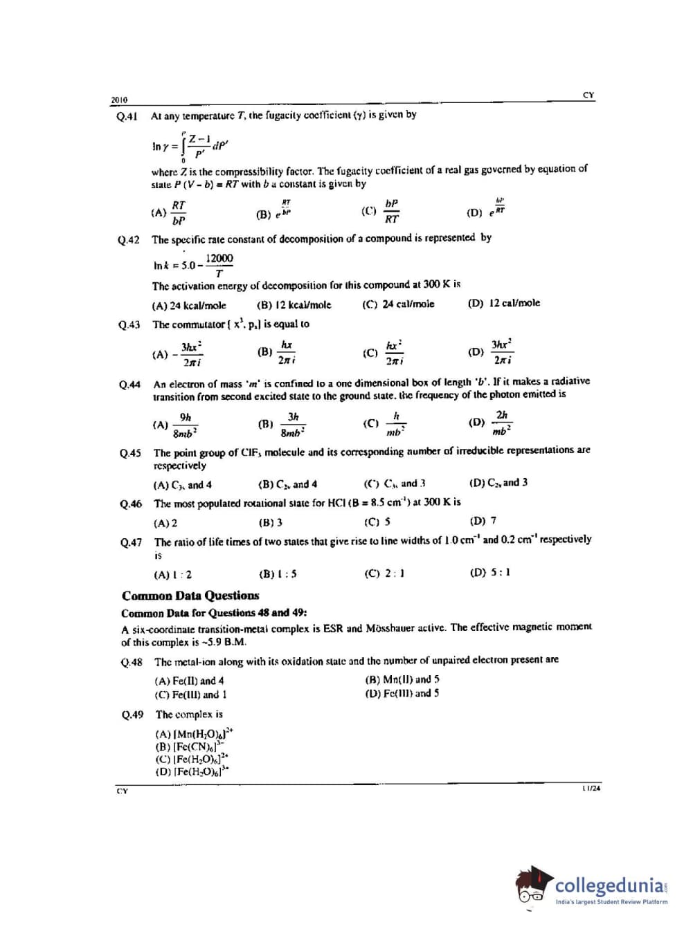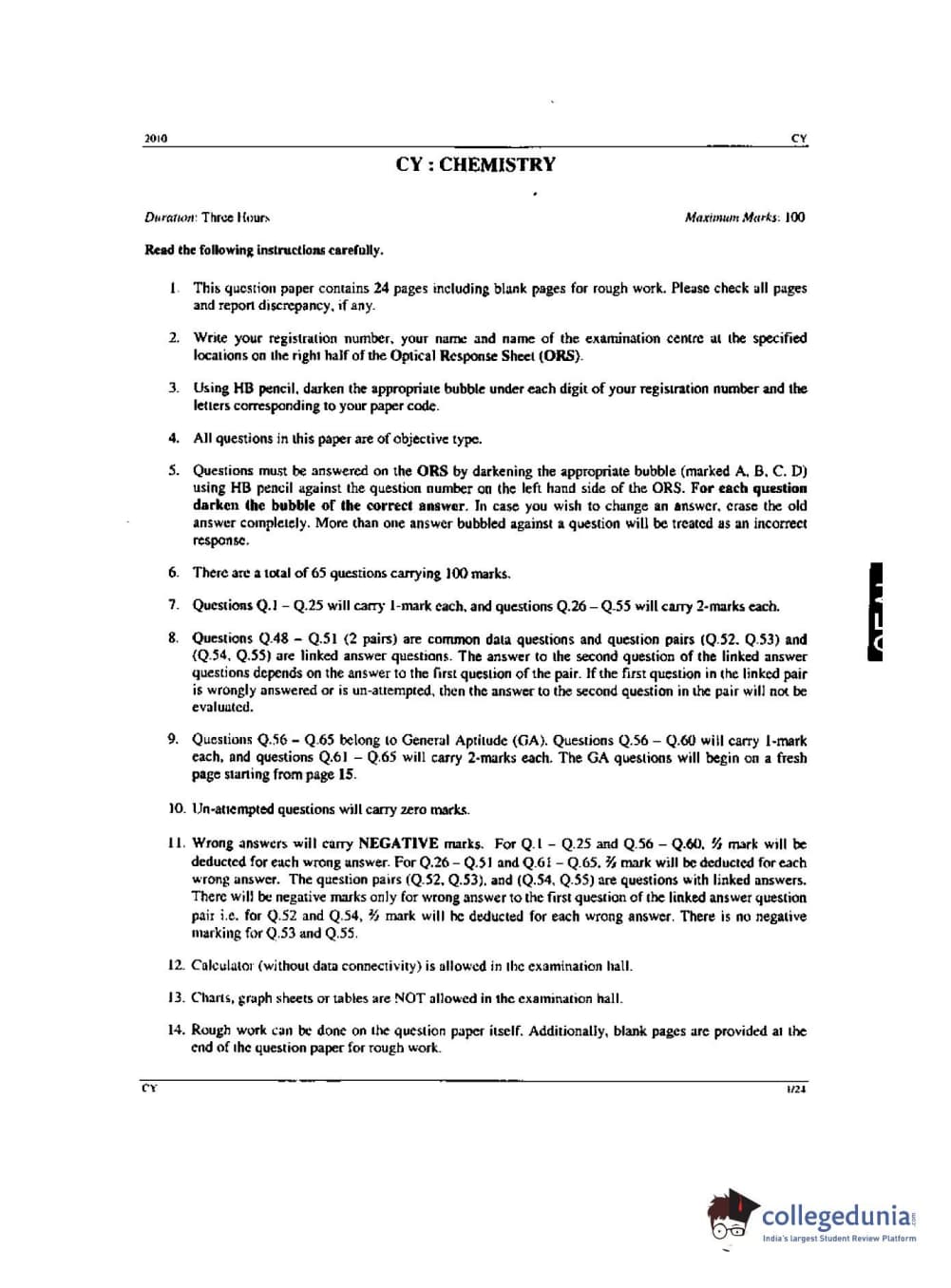 GATE 2010 Chemistry (CY) - Offline Question Paper with Answer Key pdf is available for download. The exam was conducted by IIT Guwahati on Feb-14 in the Forenoon Session. The question paper comprised a total of 65 questions from General Aptitude and Chemistry (CY) - Offline topics.
