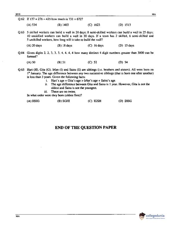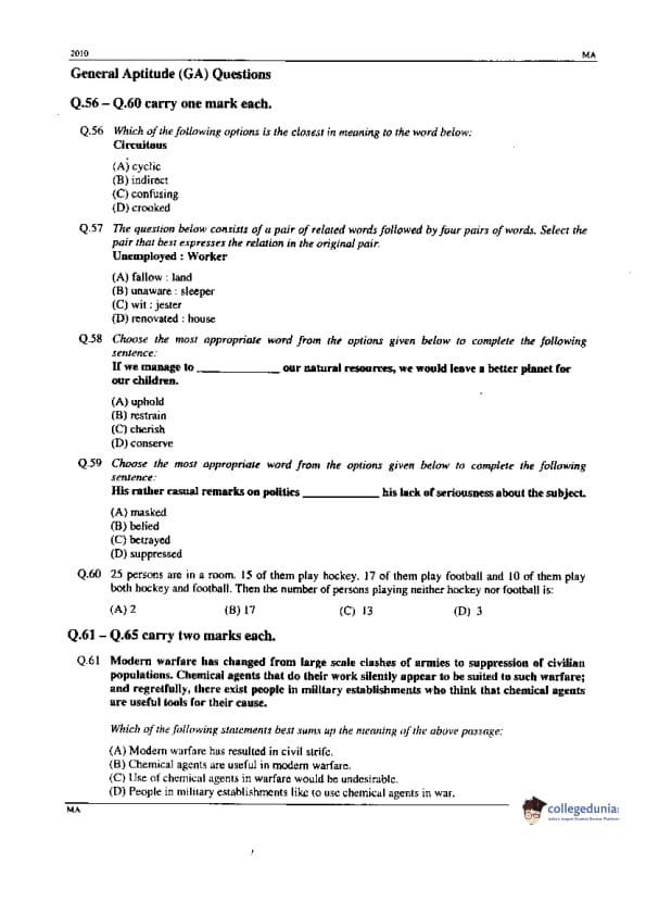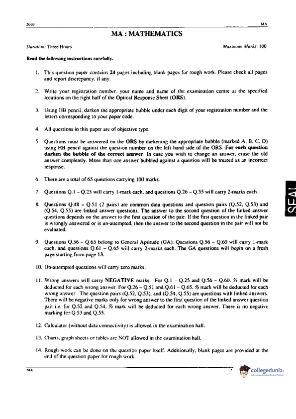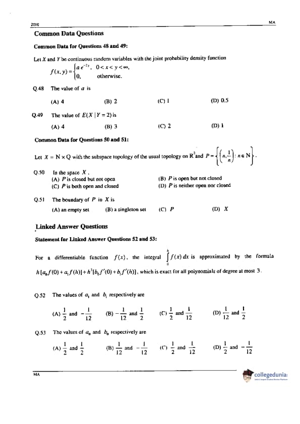 GATE 2010 Mathematics (MA) Question paper with answer key pdfs are available for download. GATE 2010 IN Paper was conducted by the Indian Institute of Technology (IIT) Guwahati in the Afternoon Session on February 14. GATE 2010 MA had an easy to moderate level. There were 65 questions in all, separated into two sections- questions from General Aptitude and questions from Mathematics. GATE 2010 IN has 42 MCQs and 23 NATs (Numerical Answer Type) questions,