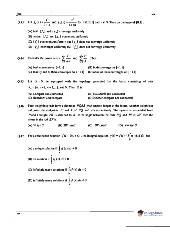 There were 65 multiple-Choice questions in GATE 2010 MA Question Paper. Questions 1 to 25 carry 1mark and 26 to 55 carry 2 marks and Question 56 to 65 belongs to General Aptitude with 56 to 60 being 1 mark and 61 to 65 comprising 2mark. The Core component was graded as 'DIFFICULT,' while the general aptitude section was evaluated as 'MODERATE.' GATE 2010 IN has 65 MCQ questions,