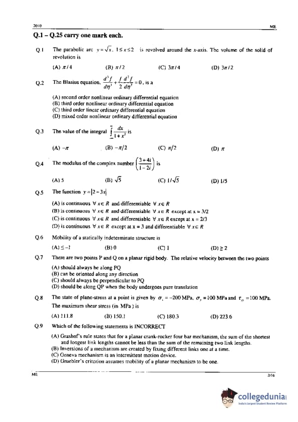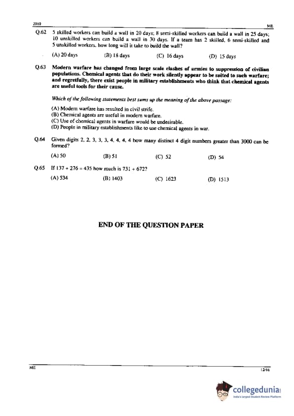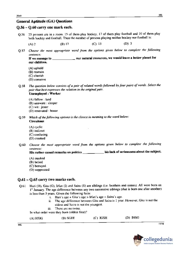 GATE 2010 Mechanical Engineering (ME) Question paper with answer key pdfs are available for download. GATE 2010 ME Paper was conducted by the Indian Institute of Technology (IIT) Guwahati in the Forenoon Session on February 14. GATE 2010 IN had a moderate difficulty level. There were a total of 65 questions with 1 mark and 2 mark MCQs from General Aptitude and Mechanical Engineering.