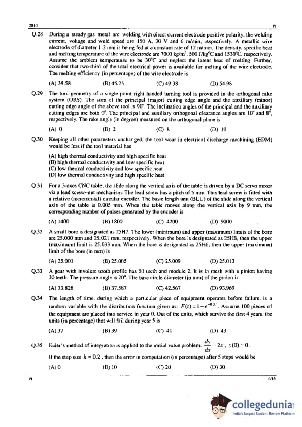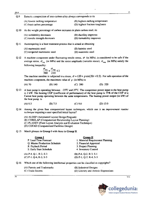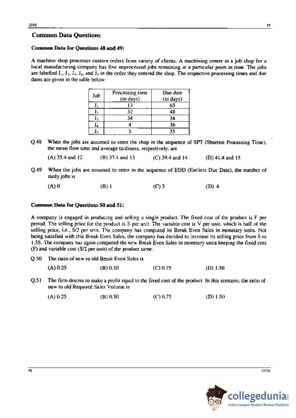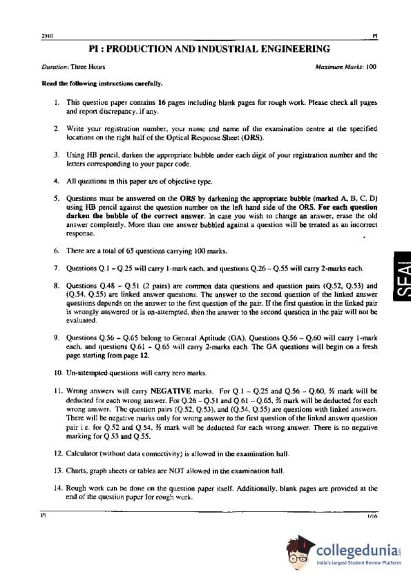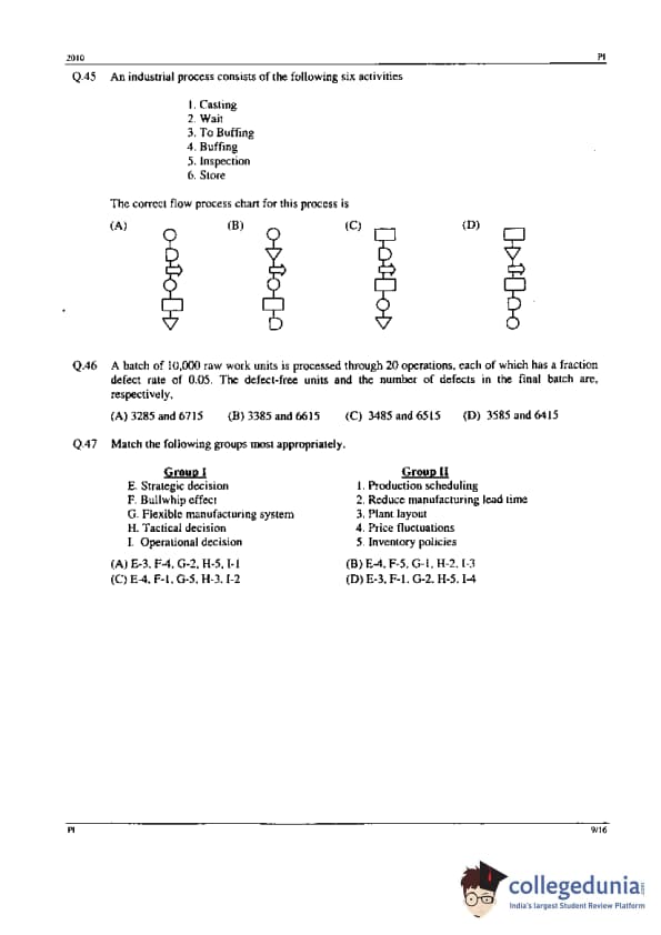GATE 2010 Production and Industrial Engineering (PI) Question Paper with Answer Key PDFs (February 14 - Forenoon Session)