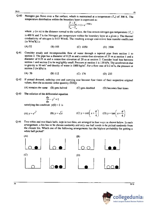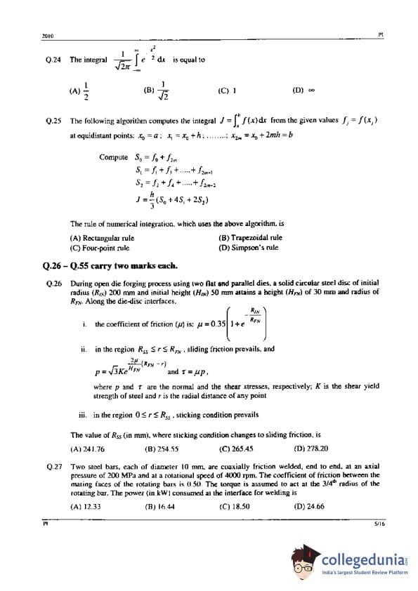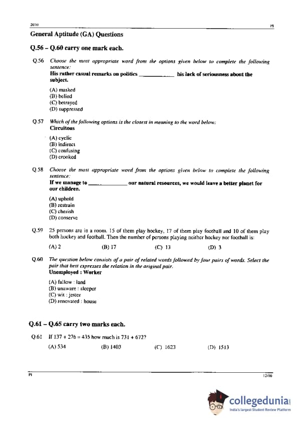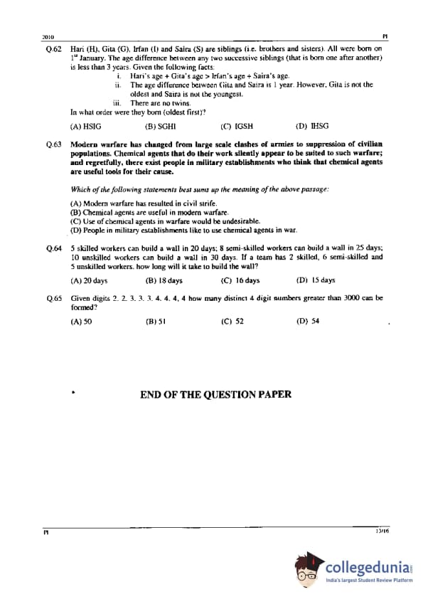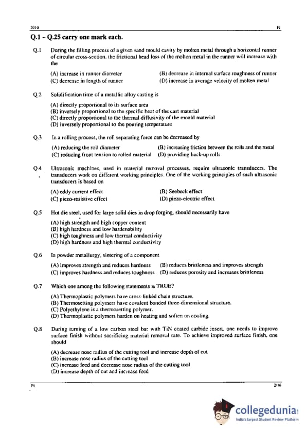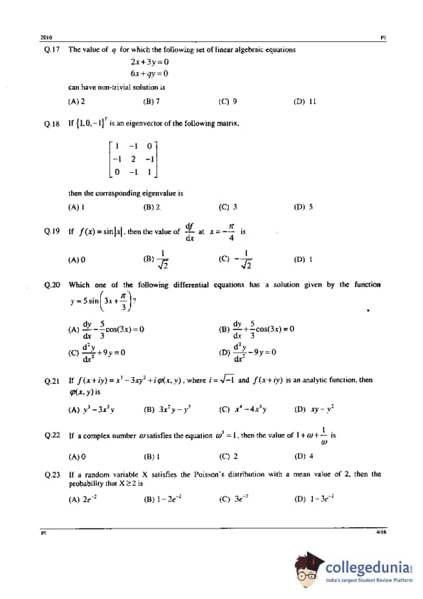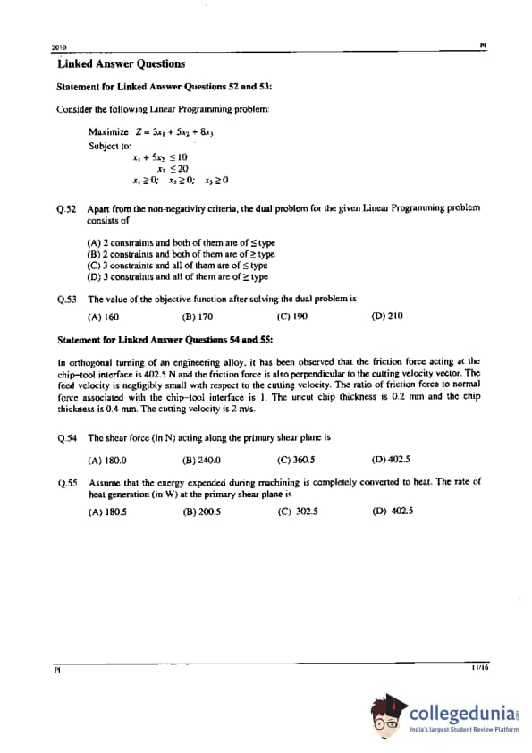 Questions 1 to 25 carry 1 mark each and Questions 26 to 55 carry 2 marks each of GATE 2010 PI question paper. Questions 56 to 65 belong to the General Aptitude Section. Question 48-51 (2 pairs) are Common Data Questions and Question Pairs (Q. 52, 53) and (Q. 54, 55) are linked answer questions.