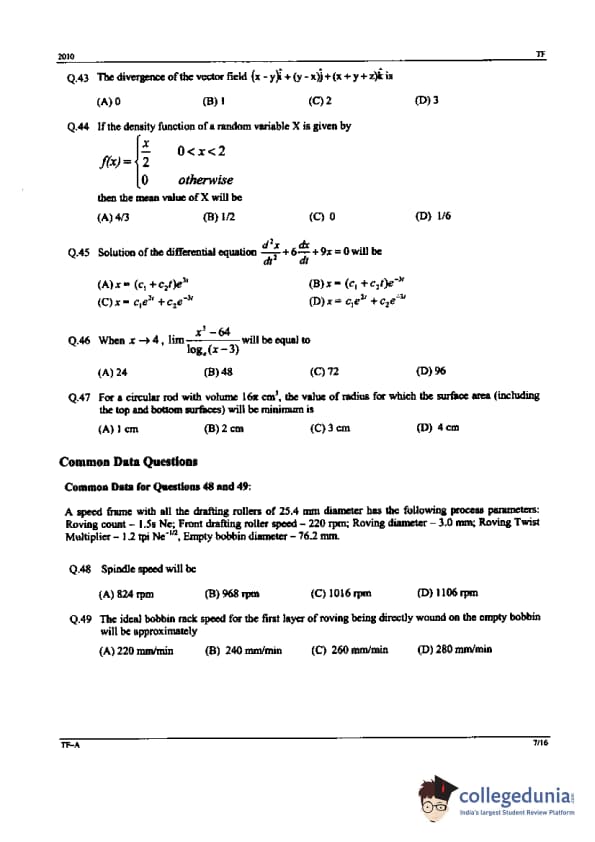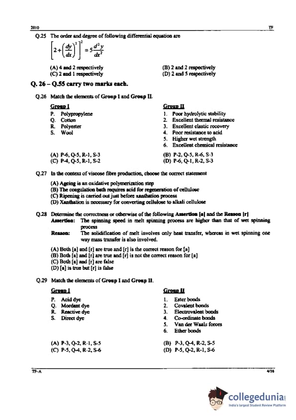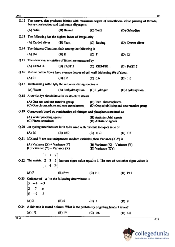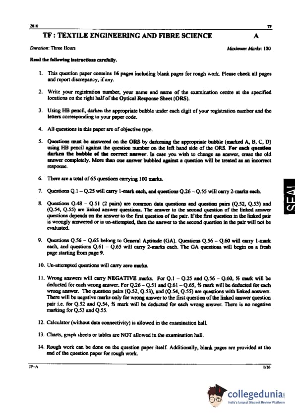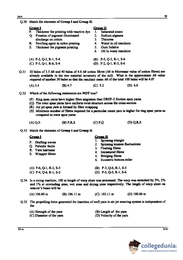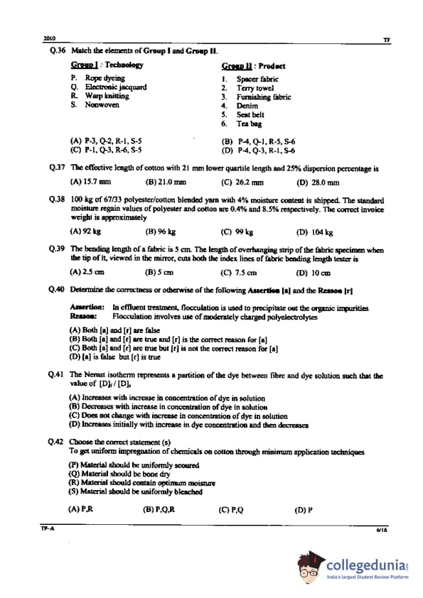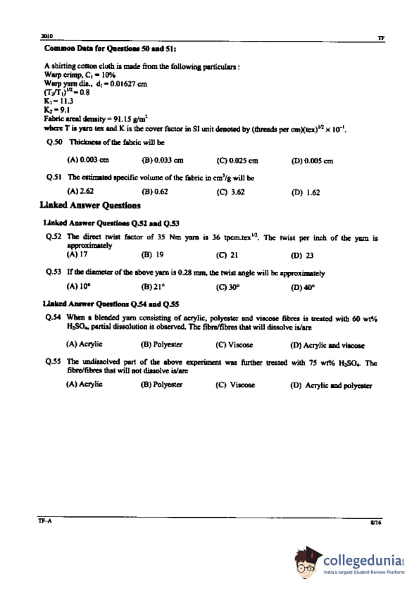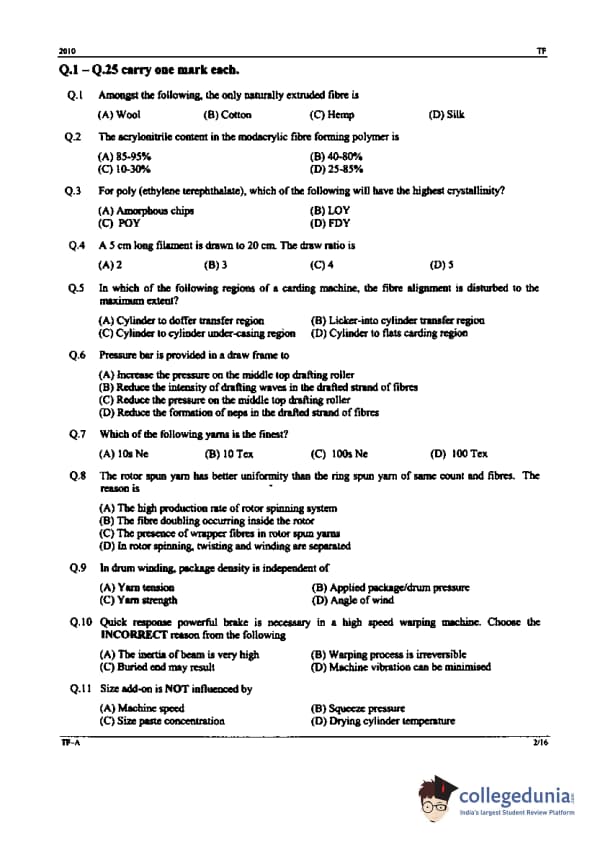 GATE 2010 Textile Engineering and Fiber Science (TF) Question Paper with Answer Key PDFs (February 7 - Forenoon Session)