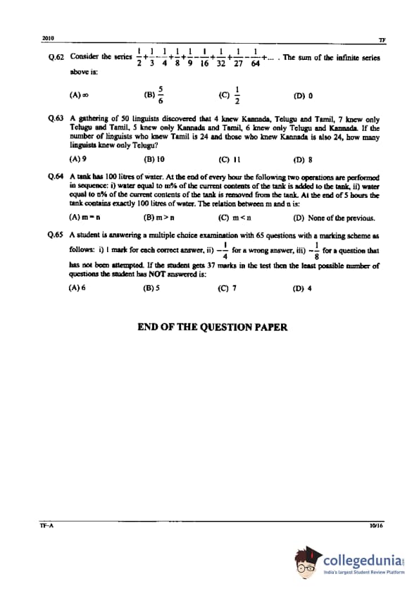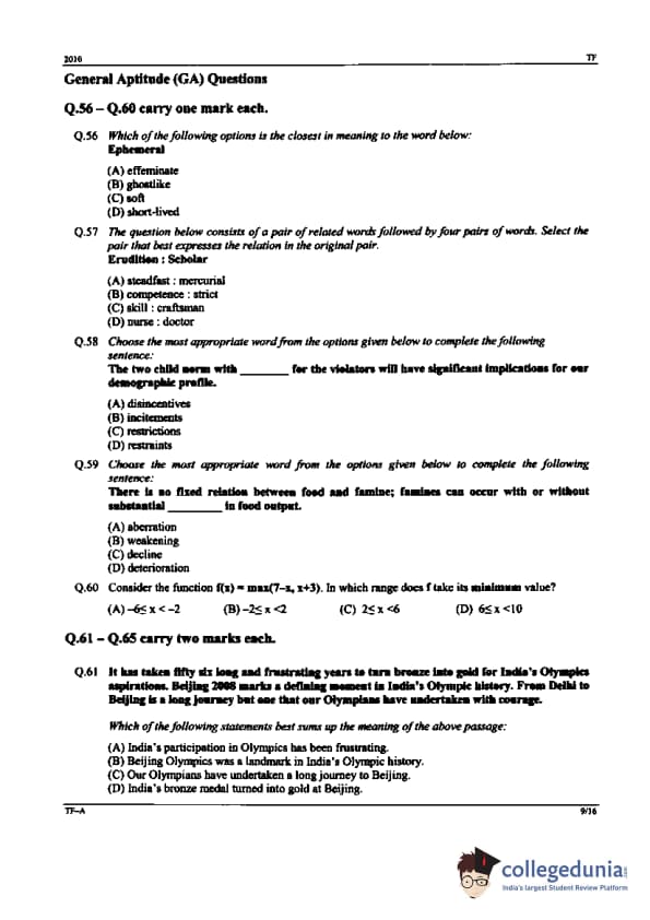Questions 1 to 25 carry 1 mark each and Questions 26 to 55 carry 2 marks each of GATE 2010 TF question paper. Questions 56 to 65 belong to the General Aptitude Section. Question 48-51 (2 pairs) are Common Data Questions and Question Pairs (Q. 52, 53) and (Q. 54, 55) are linked answer questions.