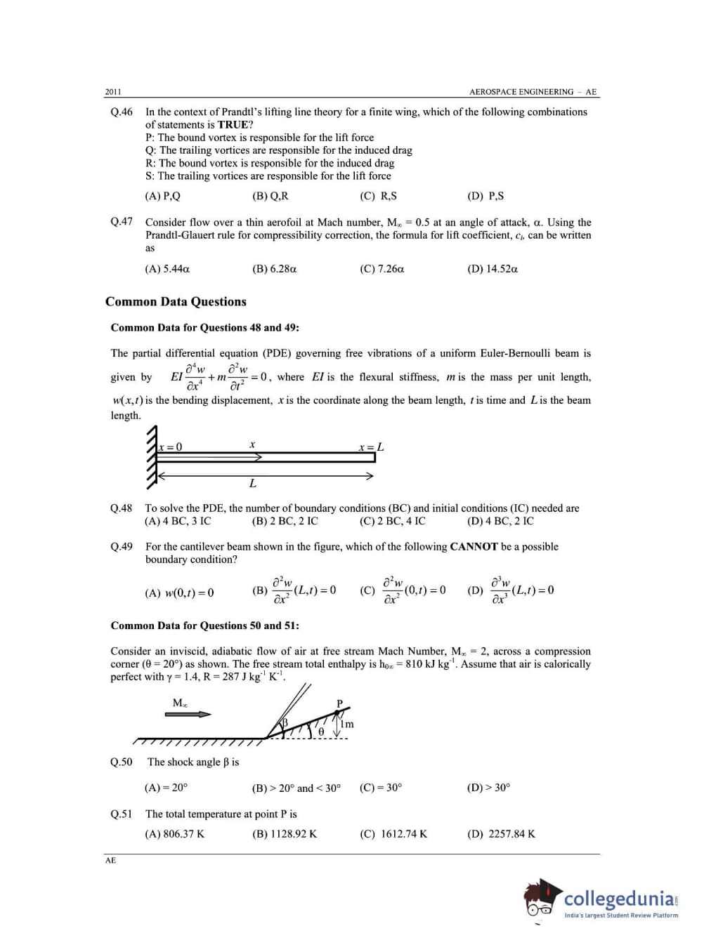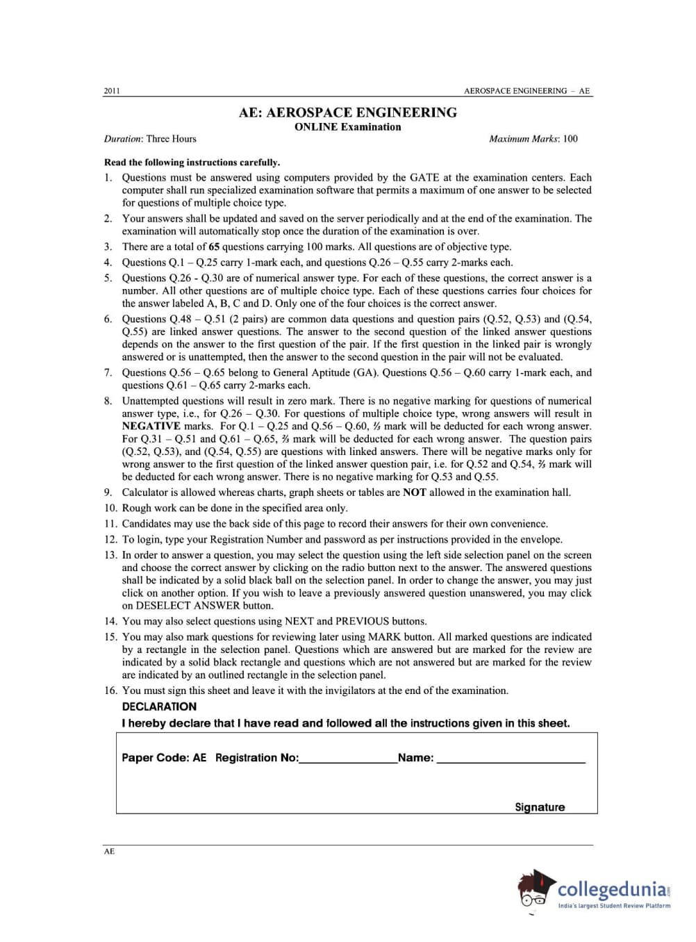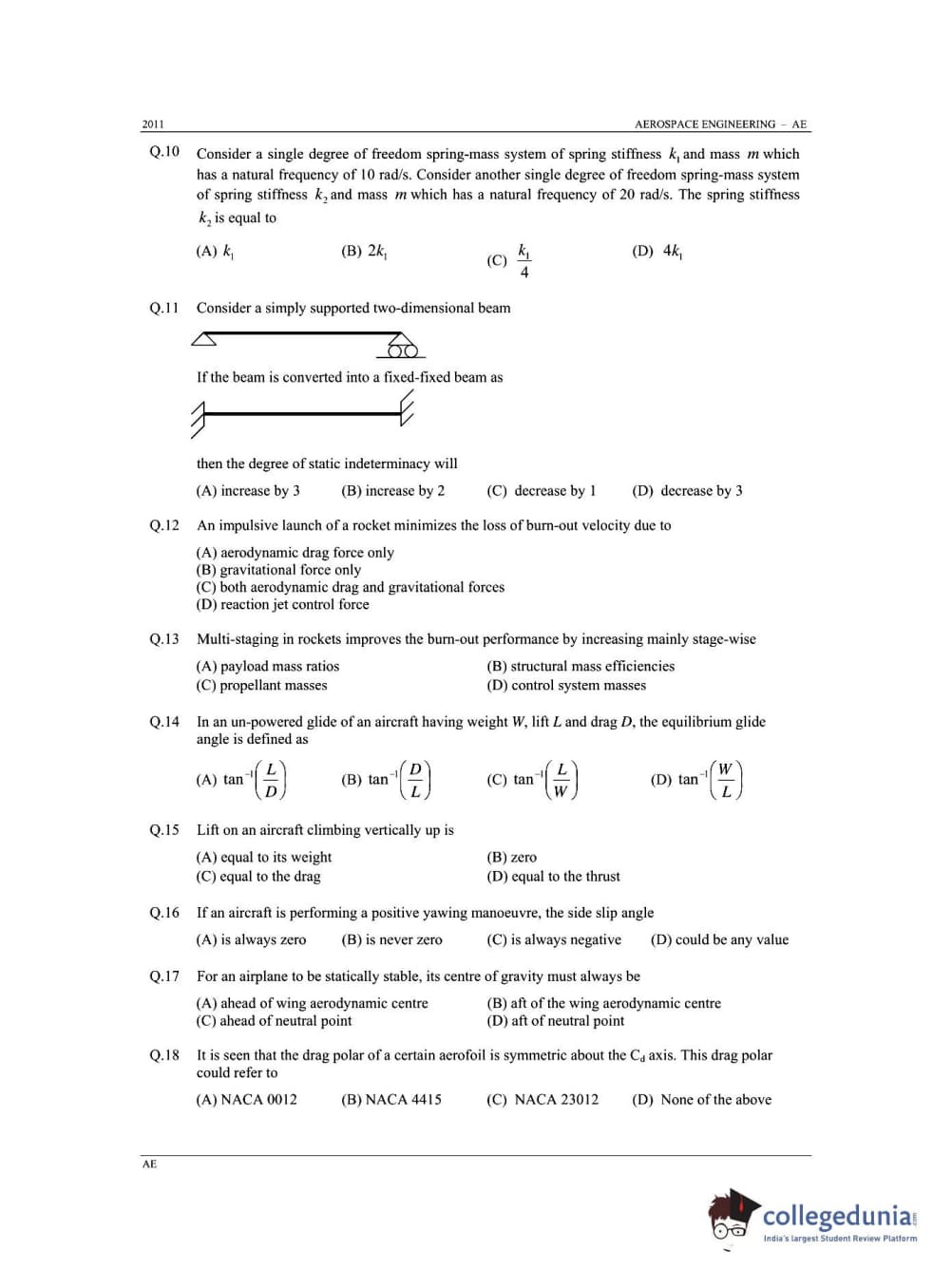 GATE 2011 Aerospace Engineering (AE) Question Paper with Answer Key PDFs are available for download.GATE 2011 was conducted by IIT Madras. GATE Aerospace Engineering paper was conducted on January 30 in the Afternoon Session. GATE 2012 AE Paper had a total of 65 questions conducted for a total of 100 marks. GATE 2011 AE Paper consisted of 55 questions from the core discipline subject- Aerospace Engineering and 10 questions from General Aptitude.