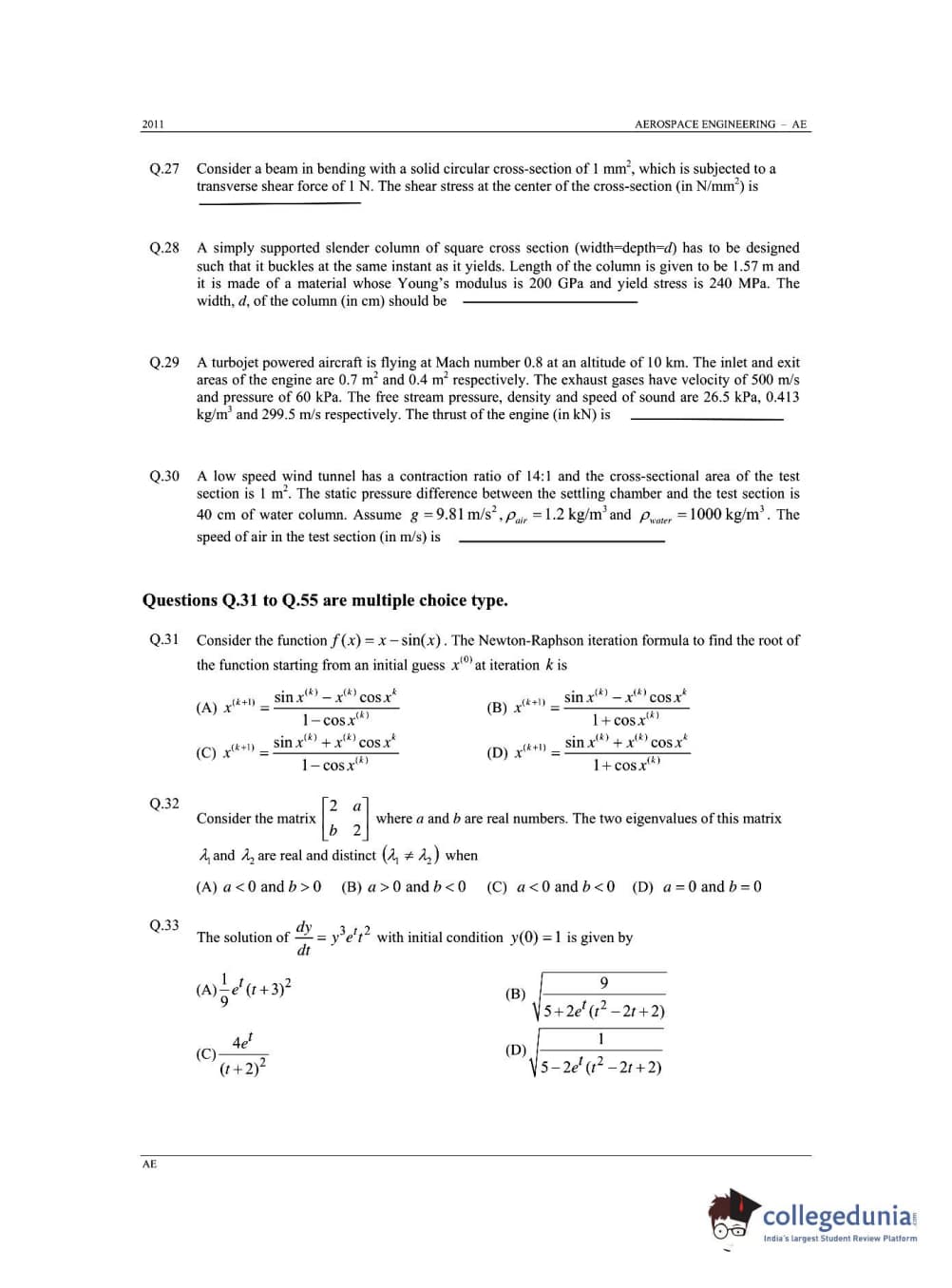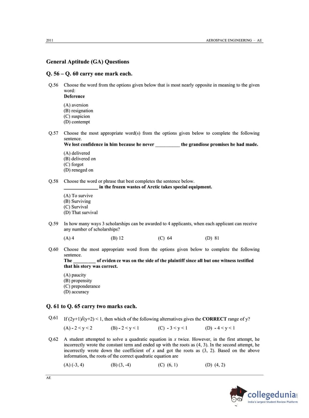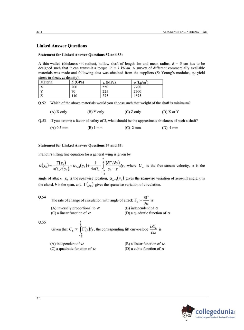 GATE 2011 Aerospace Engineering (AE) Question Paper with Answer Key PDFs are available for download.GATE 2011 was conducted by IIT Madras. GATE Aerospace Engineering paper was conducted on January 30 in the Afternoon Session. GATE 2012 AE Paper had a total of 65 questions conducted for a total of 100 marks. GATE 2011 AE Paper consisted of 55 questions from the core discipline subject- Aerospace Engineering and 10 questions from General Aptitude.