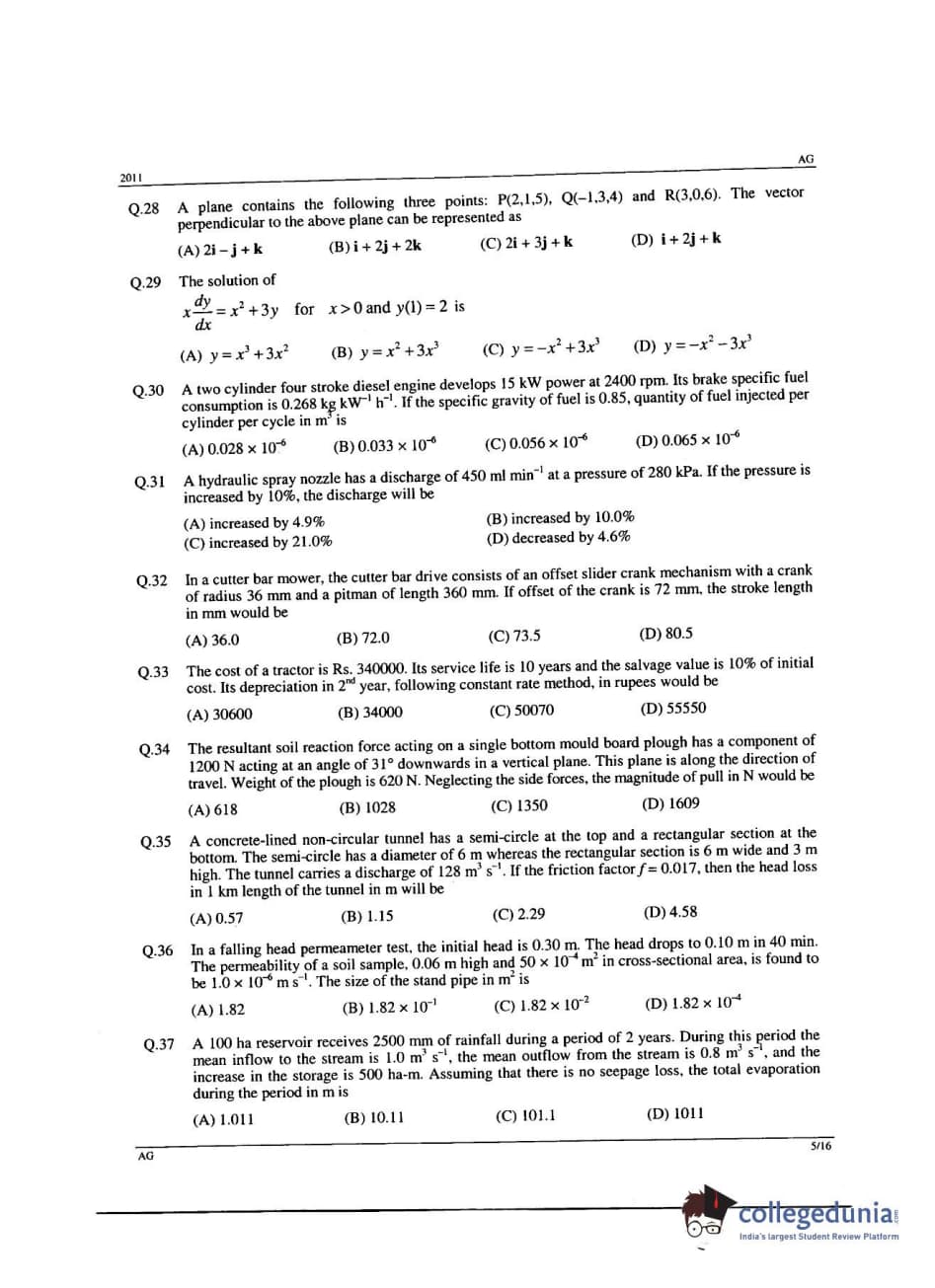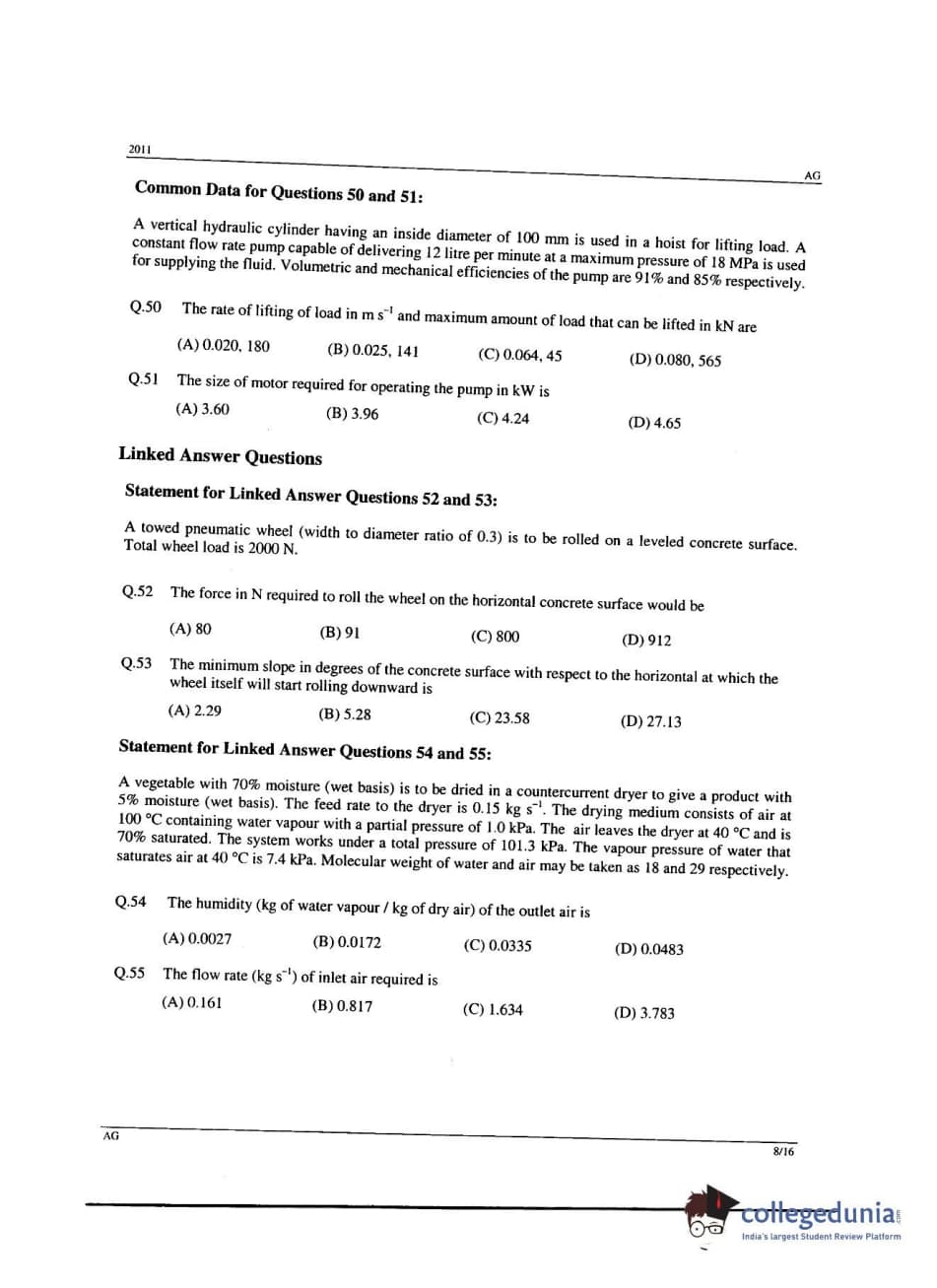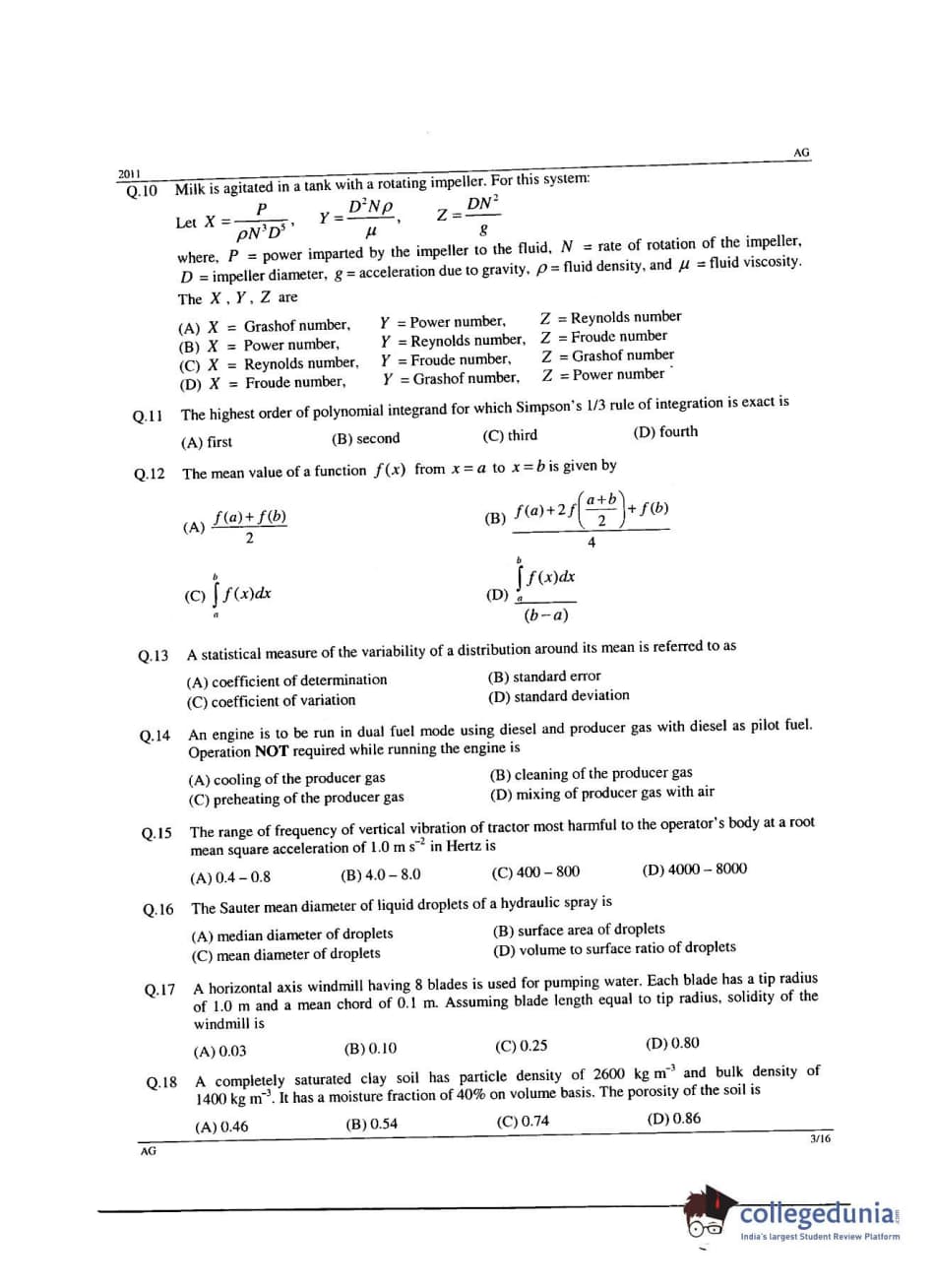GATE 2011 Agricultural Engineering (AG) Question Papers with Answer Key PDFs (February 13-Afternoon Session)