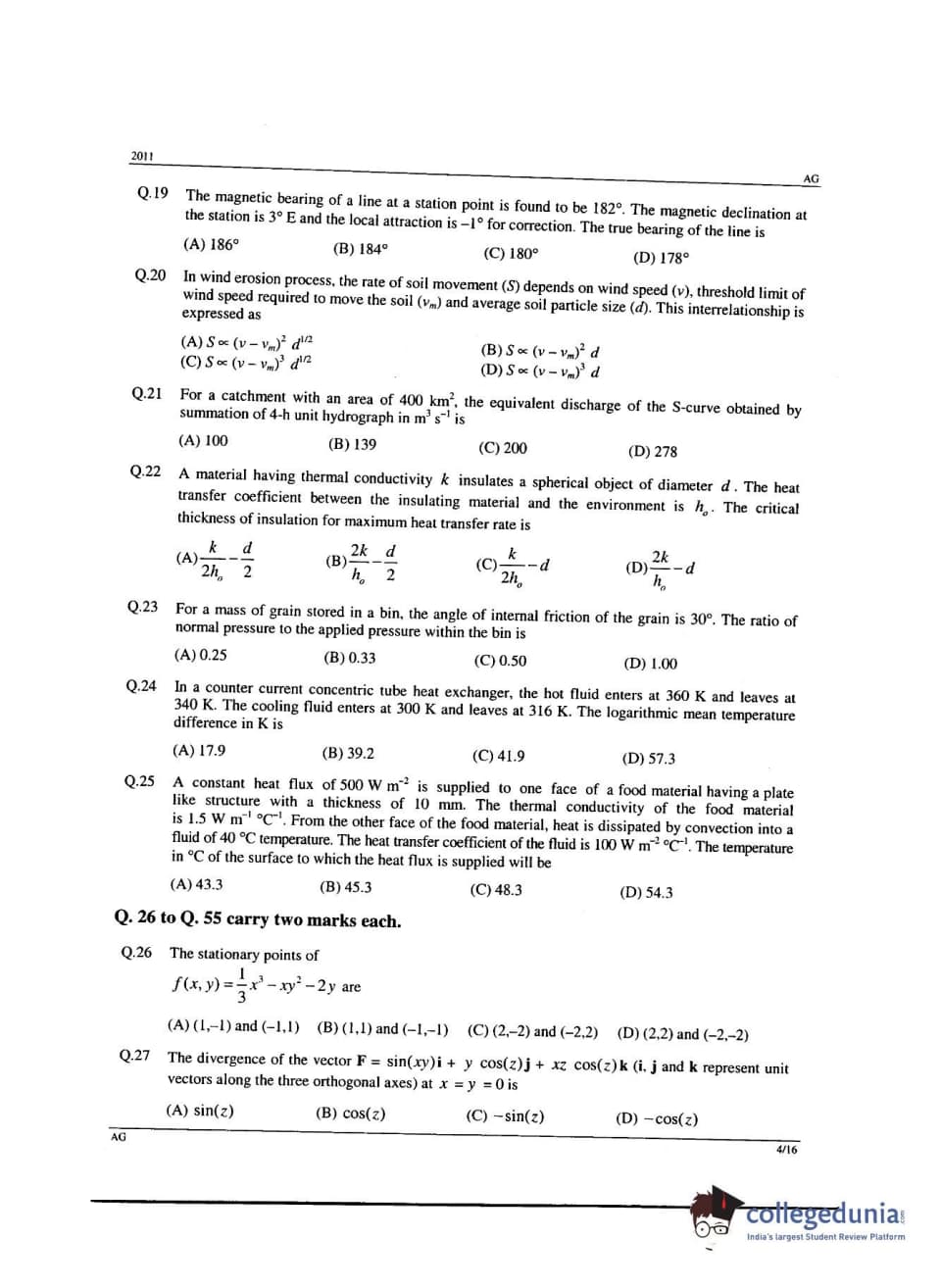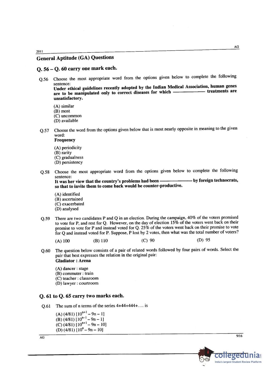 | GATE 2011 Agriculture Engineering (AG) Question Paper | GATE 2011 Agriculture Engineering (AG) Answer Key |
