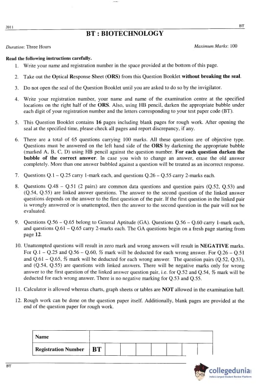 GATE 2011 Biotechnology (BT) Question Paper and Answer Key PDFs are now available to download. In 2011, IIT Madras took the responsibility for conducting GATE 2011. The test-takers described the difficulty level as moderate. GATE 2011 Biotechnology (BT) was held on 13 February, 2011 in the Forenoon Session. GATE 2011 BT Question Paper had 65 questions carrying 100 marks.