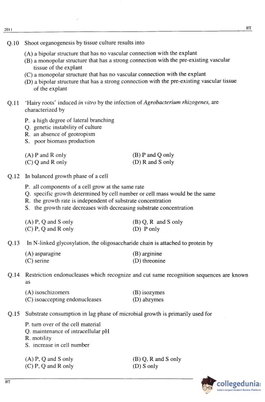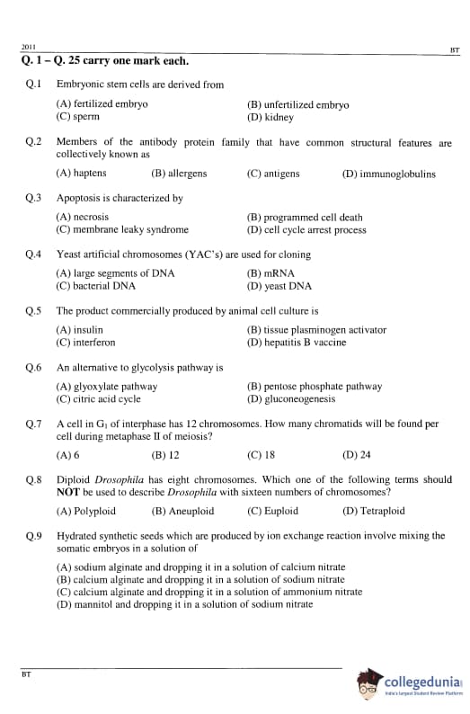 GATE 2011 Biotechnology (BT) Question Papers with Answer Key PDFs (February 13-Forenoon Session)