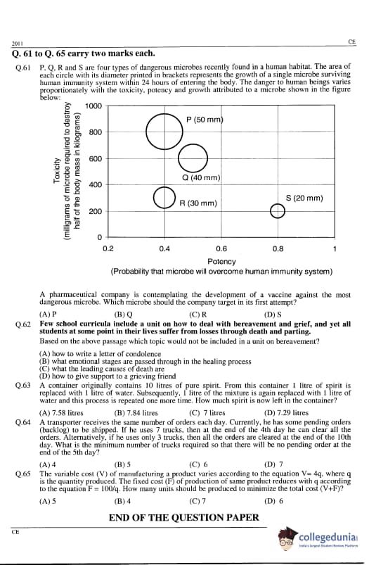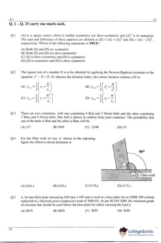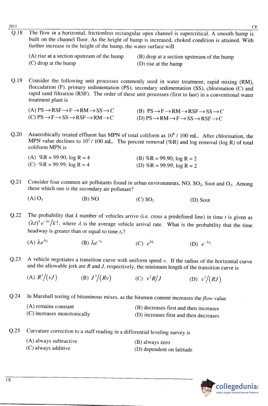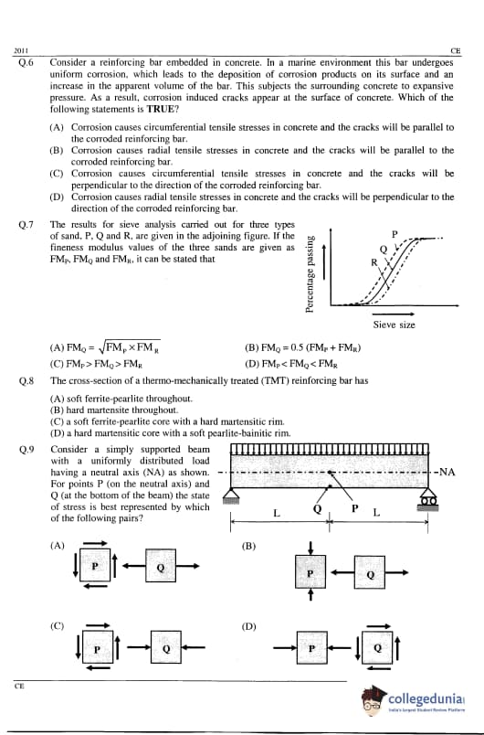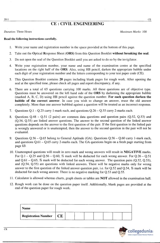 GATE 2011 Civil Engineering (CE) Question Paper and Answer Key PDFs are now available to download. GATE 2011 CE Paper was conducted by IIT Madras The test-takers described the difficulty level as moderate. GATE 2011 Civil Engineering (CE) was held on February 13, 2011 in the Forenoon Session. GATE CE Question Paper had 65 questions carrying 100 marks.
