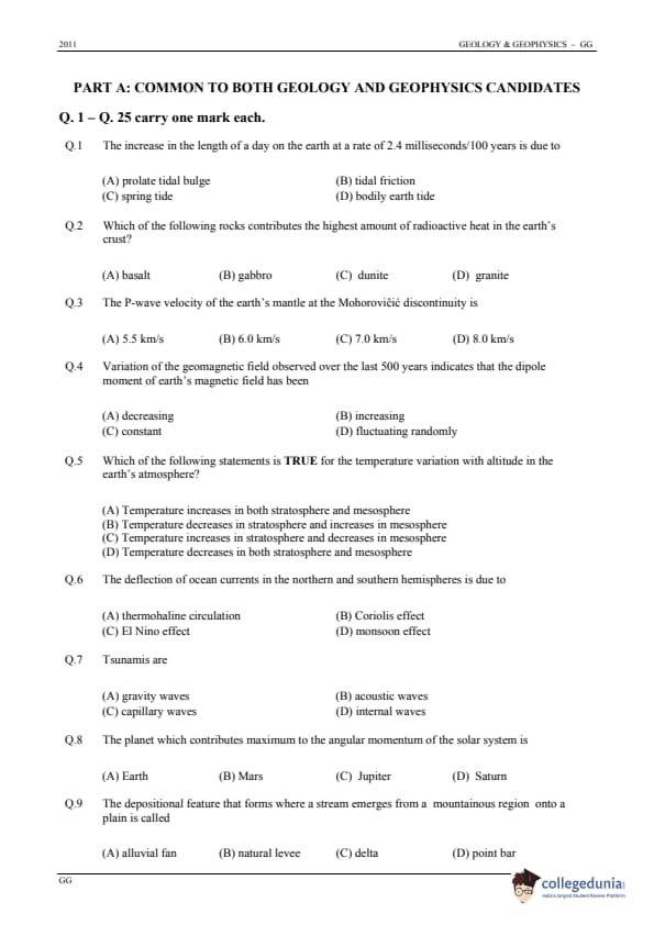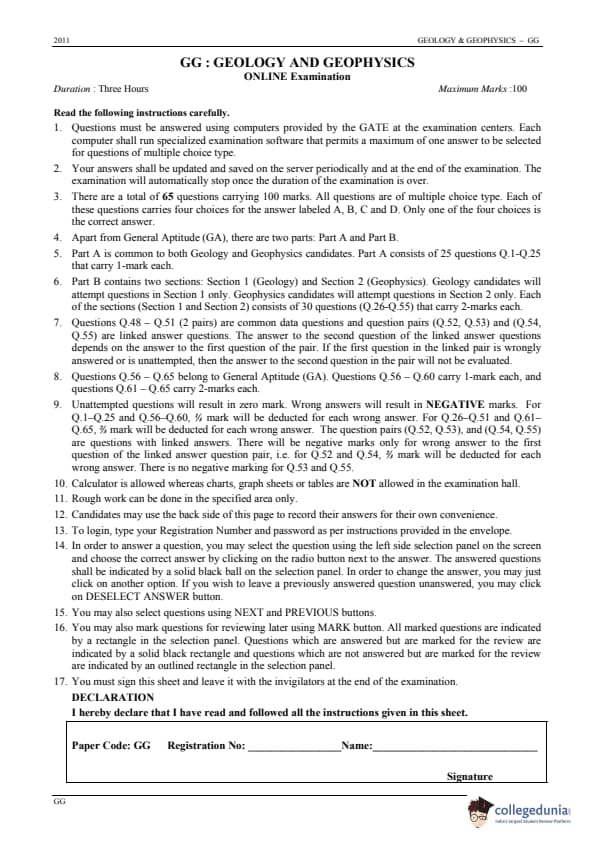 GATE 2011 Geology and Geophysics (GG) Question Paper with Answer Key PDFs are available for download. GATE exam for Geology and Geophysics consists of sections of General Aptitude comprising of 15%, Engineering Mathematics for 15% and Core Discipline for remaining 70%. The conducting body for the paper was IIT Madras which held the paper on January 30th, Forenoon Session. The whole paper is for 100 marks comprising 65 questions. The majority of questions is on core subject and rest on General Aptitude and Engineering Mathematics.