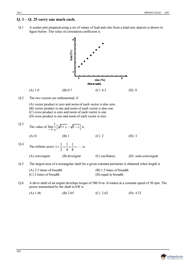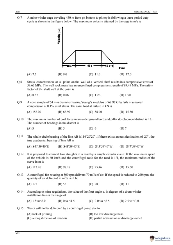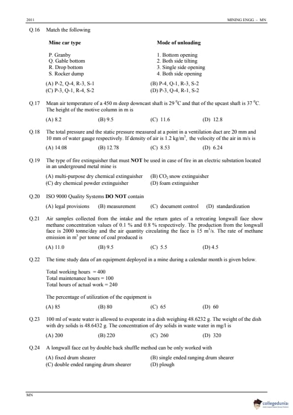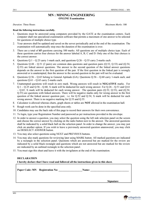 GATE 2011 MN Question Paper with answer key PDFs are available to download. GATE 2011 MN was conducted by IIT Madras on January 30, 2011 in the afternoon session. The question of GATE Mining Engineering (MN) 2011 was from the General Aptitude and core Mining Engineering section. The total questions in GATE 2011 MN Paper were 65 out of which the General Aptitude section comprise 10 questions and the Mining Engineering section consisted of 55 questions. The overall difficulty of GATE 2011 MN paper was rated as difficult.