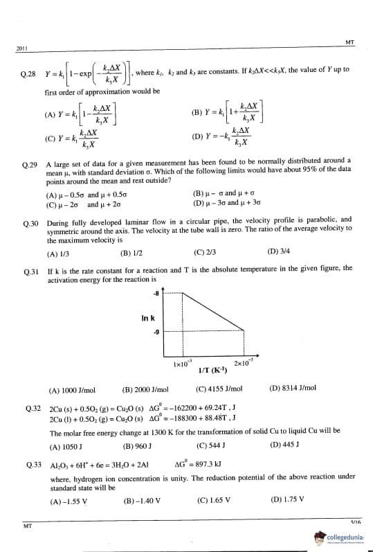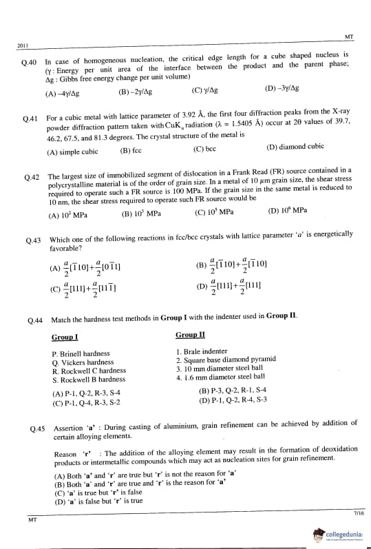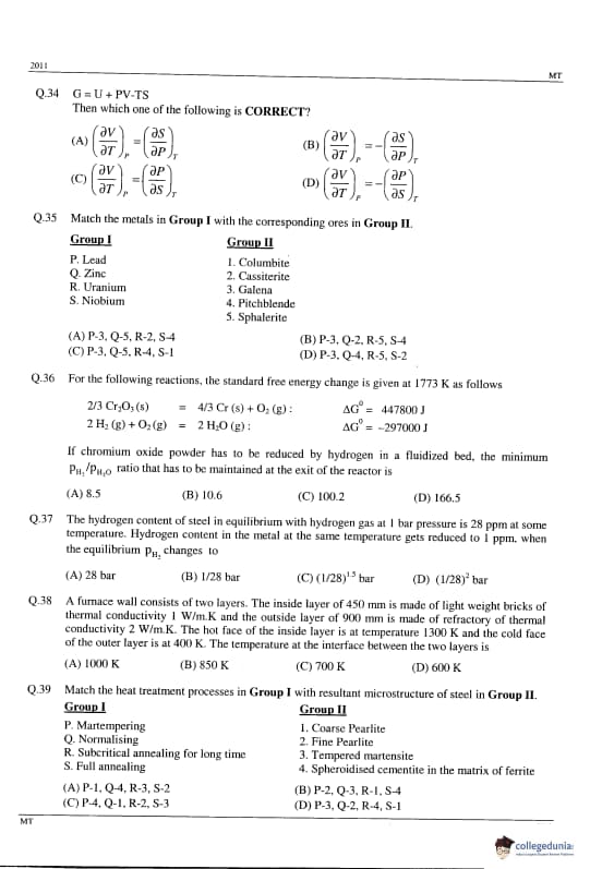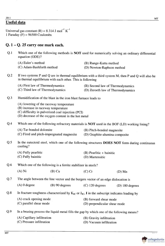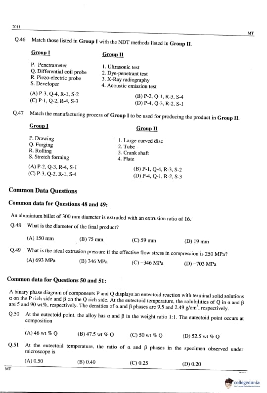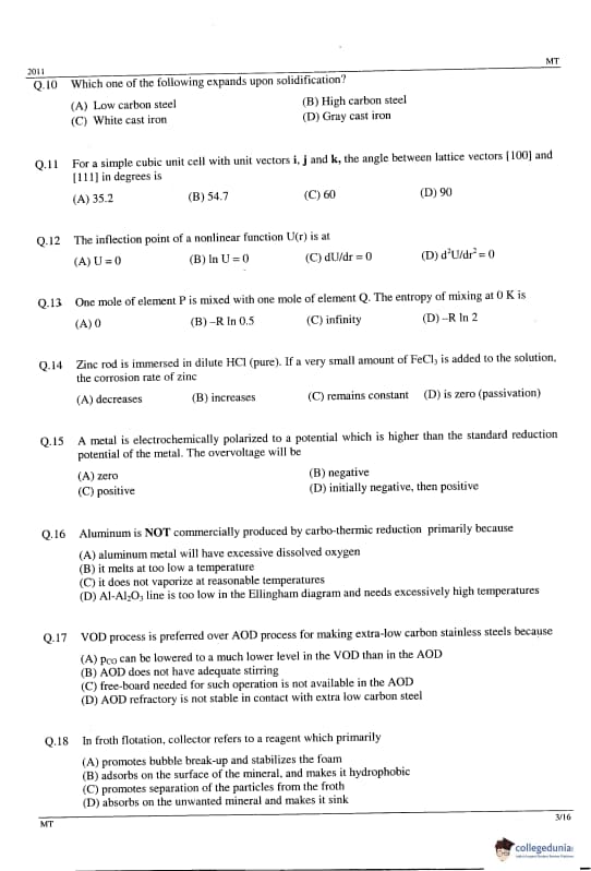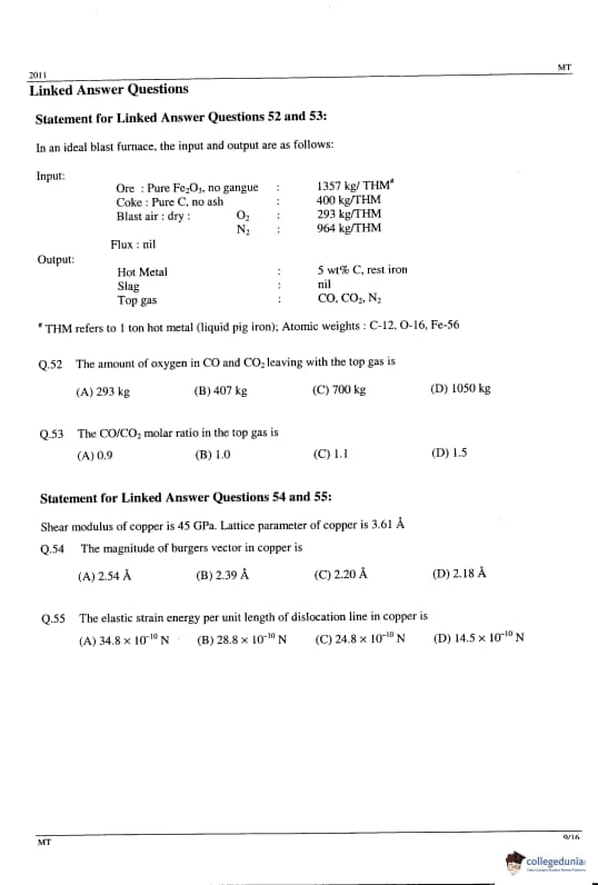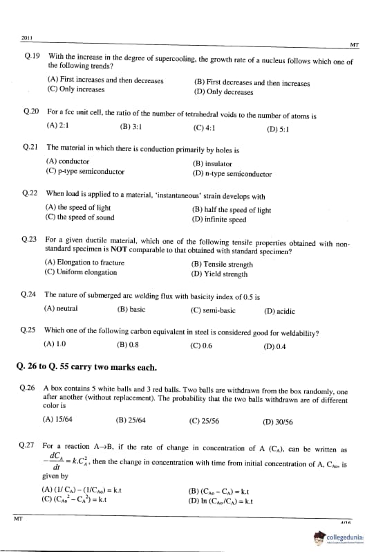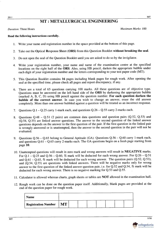 GATE 2014 MT Question Paper with answer key is available to download. GATE 2011 MT was conducted by IIT Madras on February 13, 2011 in the afternoon session. GATE Metallurgical Engineering (MT) 2011 question paper consists of the General Aptitude and core Metallurgical Engineering section. The total questions in GATE 2011 MT Paper were 65 out of which the General Aptitude section comprise 10 questions and the Mining Engineering section consisted of 55 questions. The overall difficulty of the GATE 2011 MT paper was rated as difficult.
