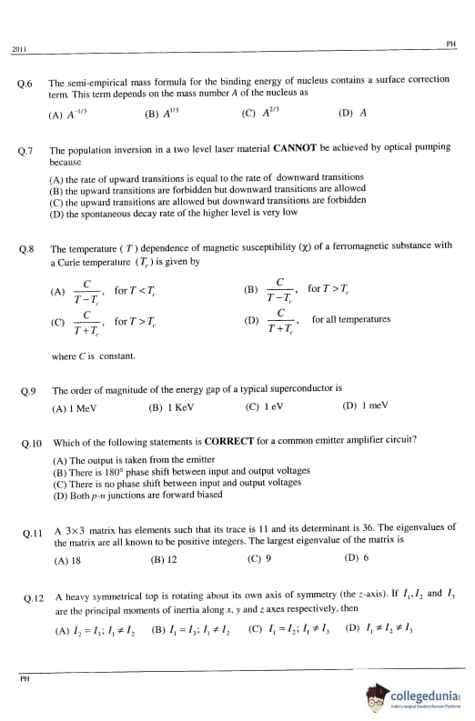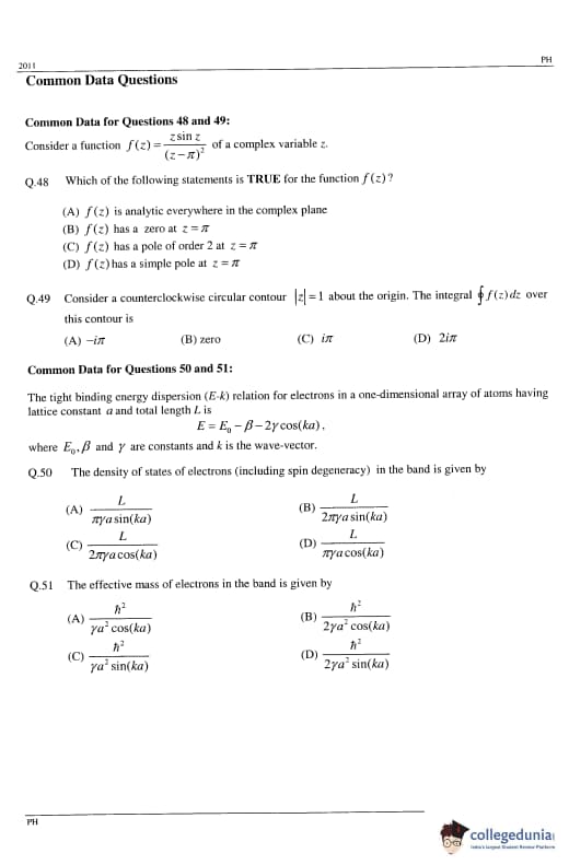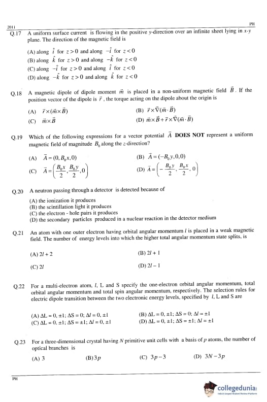 GATE 2011 PH Question Paper with answer key PDFs are available for download. GATE 2011 PH was conducted by IIT Madras on February 13, 2011 in the forenoon session. The total questions in GATE 2011 PH Paper were 65 out of which the General Aptitude section comprise 10 questions and the Physics section consisted of 55 questions. The overall difficulty of the GATE 2011 PH paper was rated as easy to moderate.