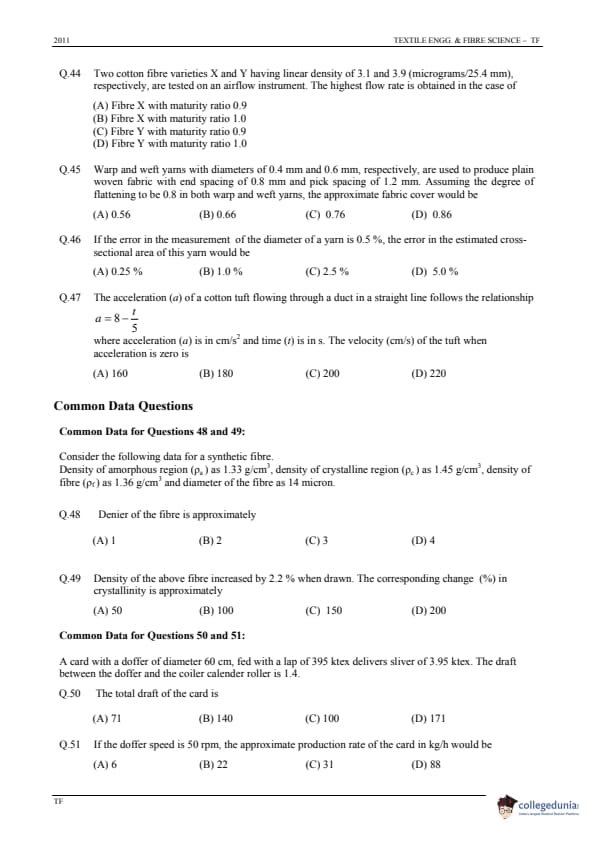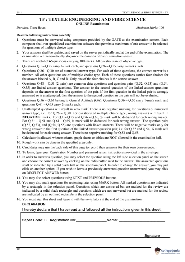 GATE 2011 Textile Engineering and Fibre Science (TF) Question Paper and Answer Key PDFs are available for download. The exam was conducted on January 30, 2011 by IIT Madras. GATE 2011 TF paper was conducted for 100 marks with a total of 65 questions. The paper contained 55 questions from the core subject and the rest 10 questions were of general aptitude.