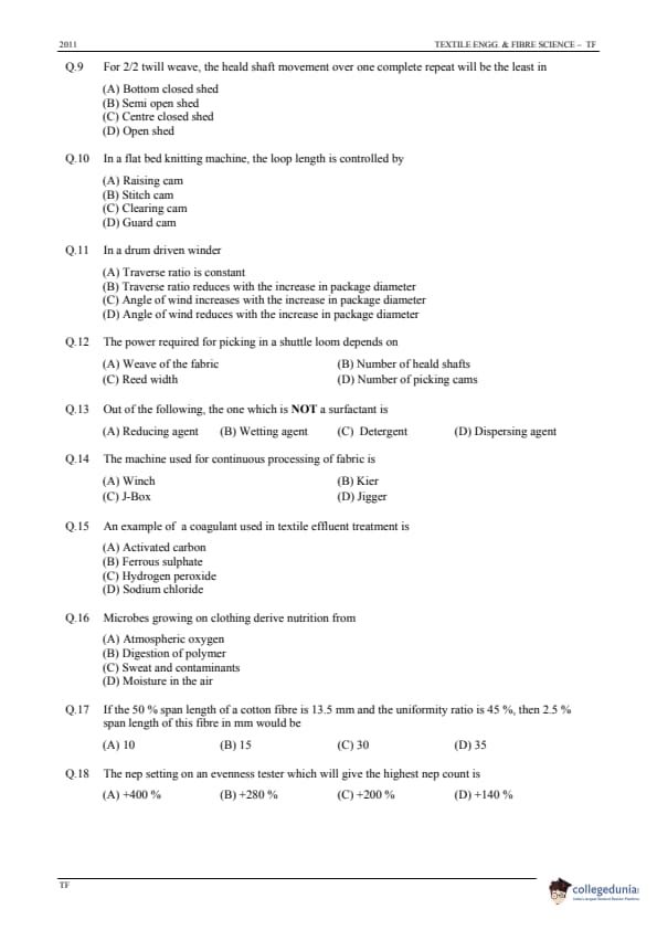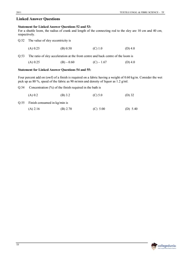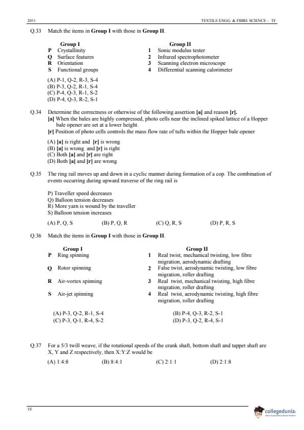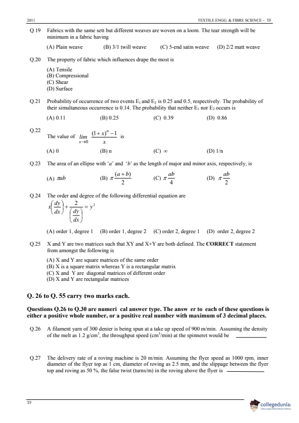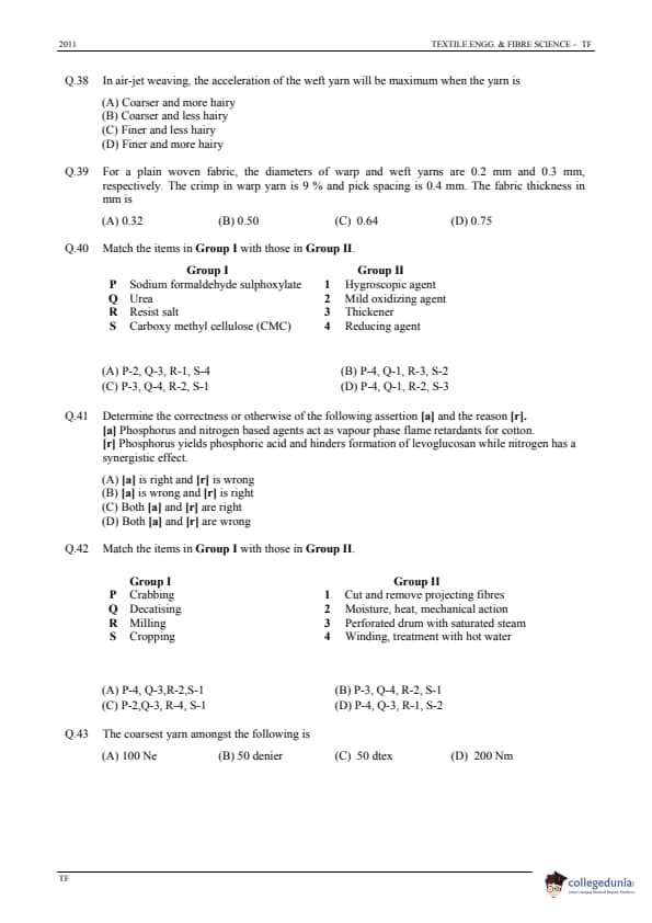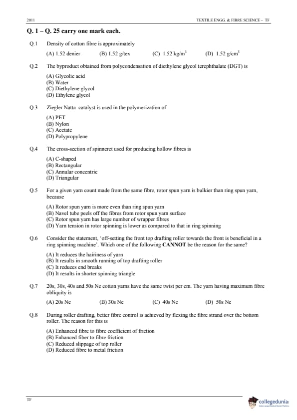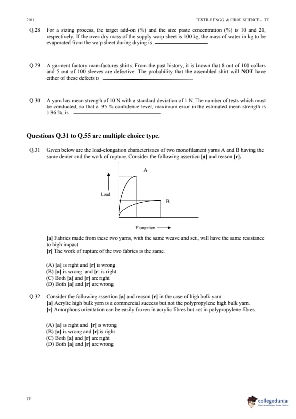 GATE 2011 Textile Engineering and Fibre Science (TF) Question Paper and Answer Key PDFs January 30 – Forenoon Session)