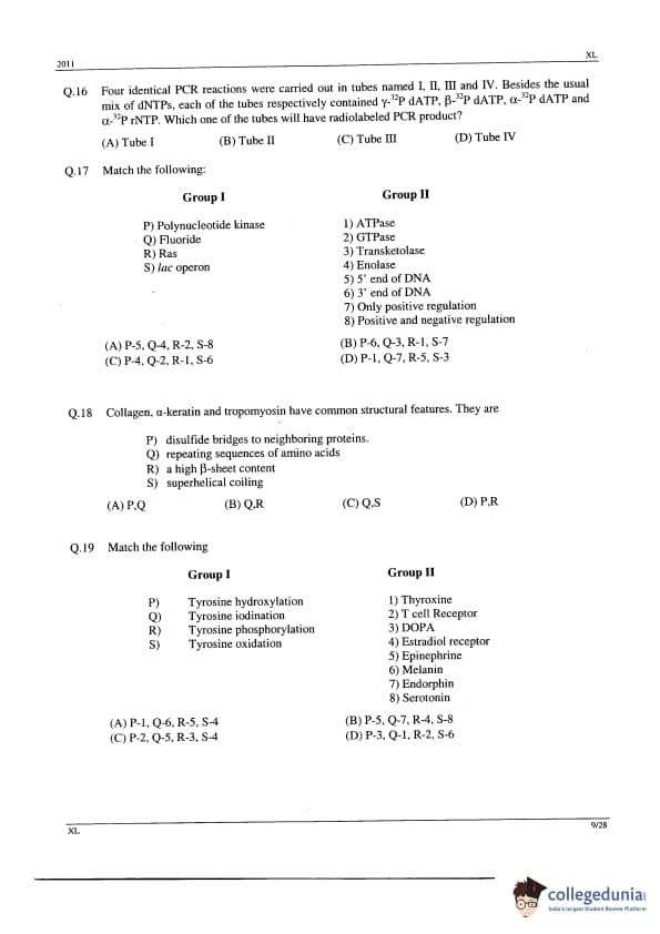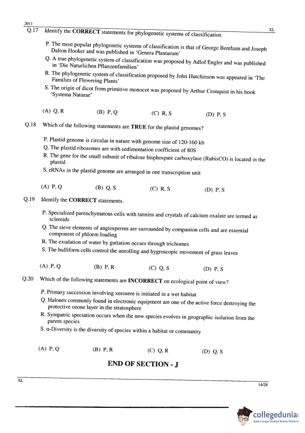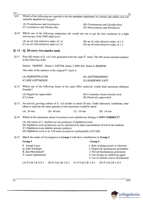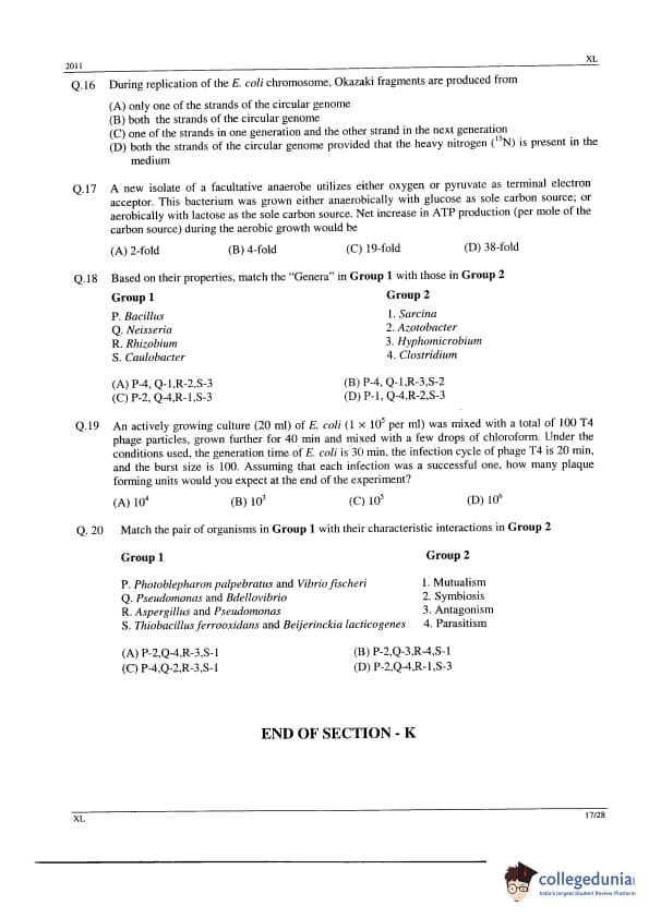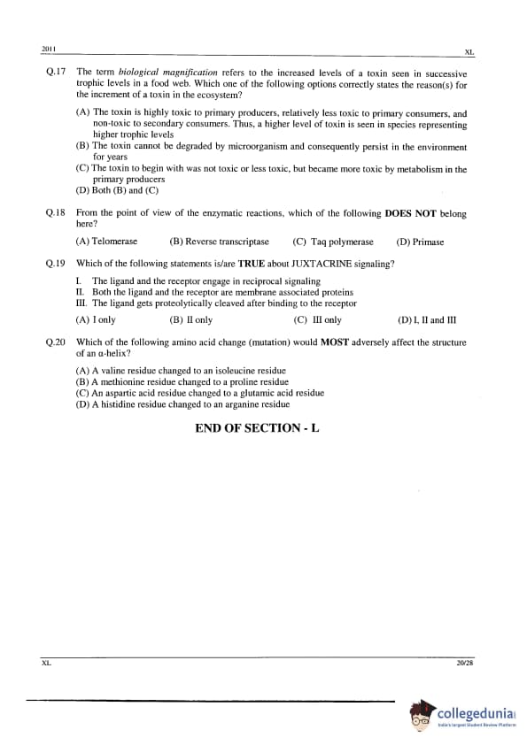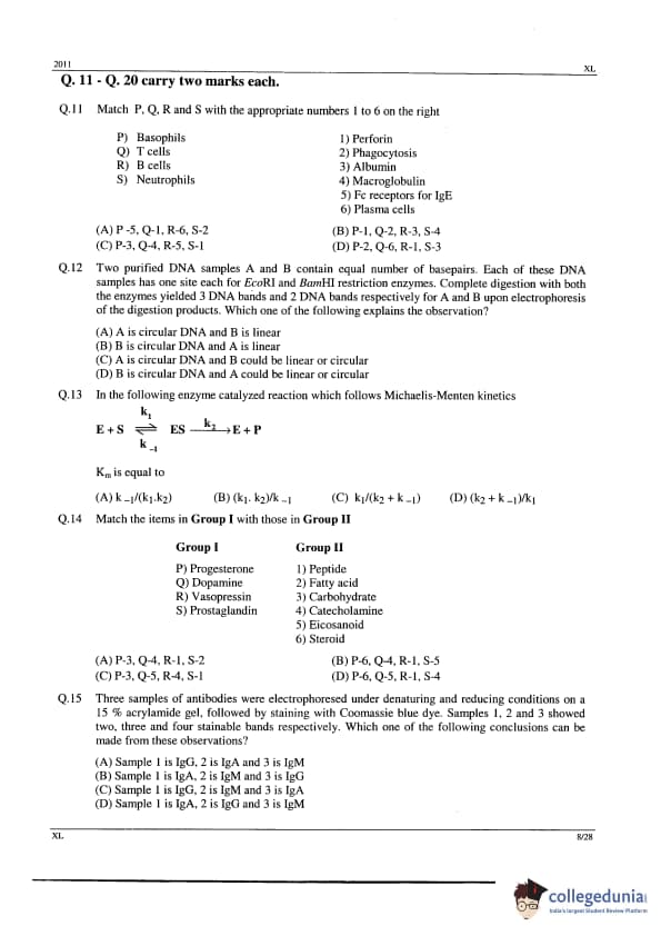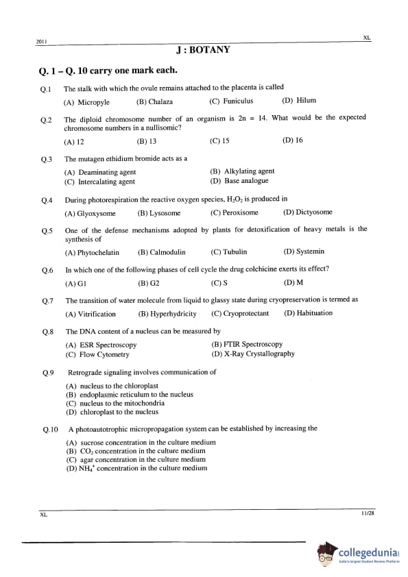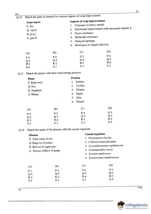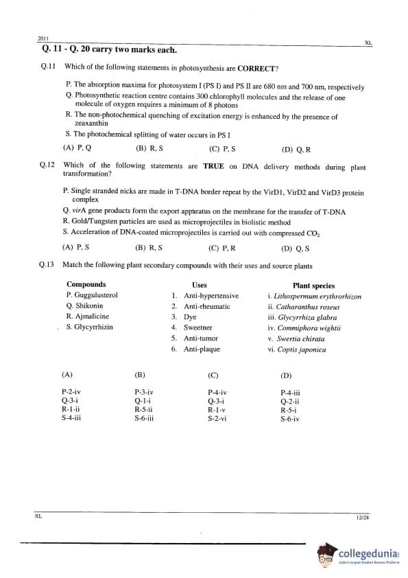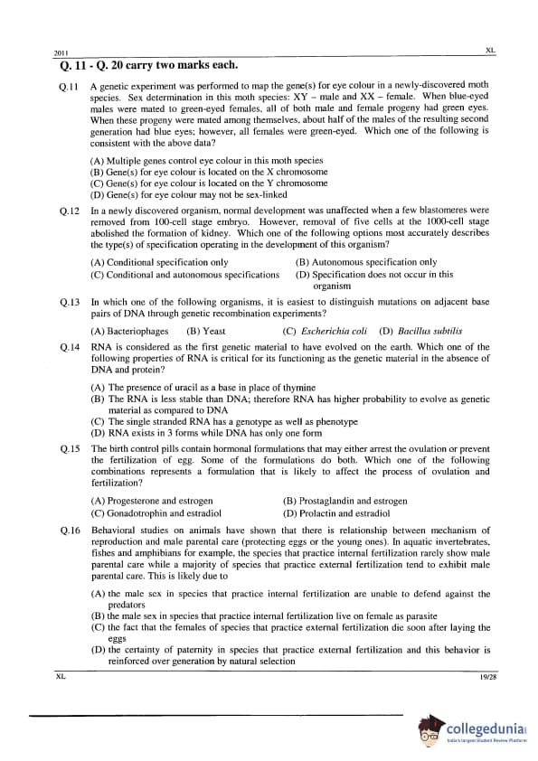 GATE 2011 Life Sciences (XL) Question Papers with Answer Key PDFs (February 13 – Afternoon Session)