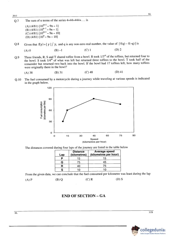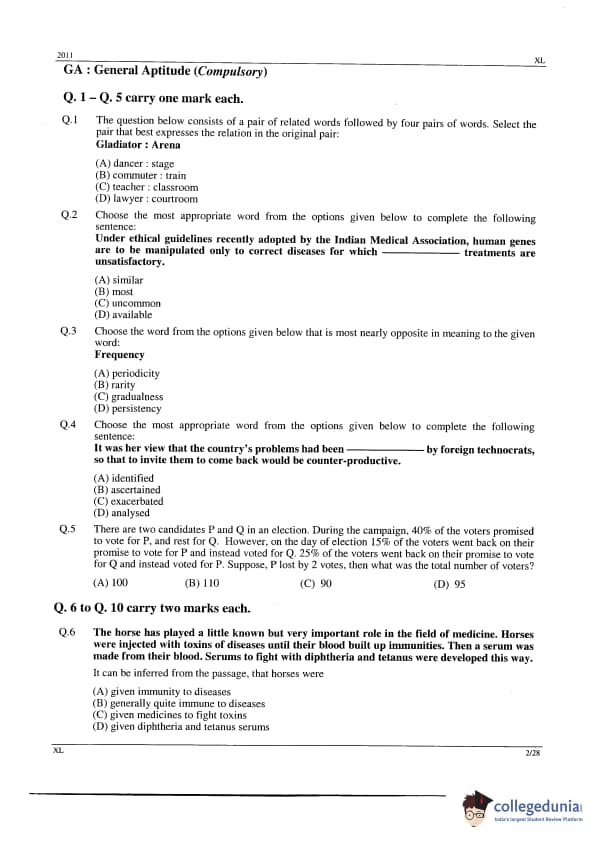 GATE XL 2011 contained 65 questions with a division of 1 mark question and 2 marks question over the paper.