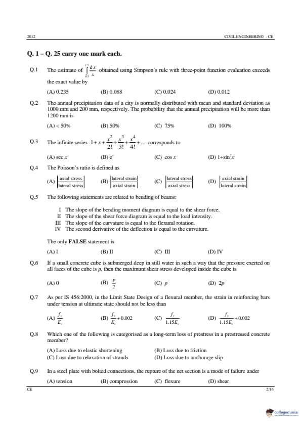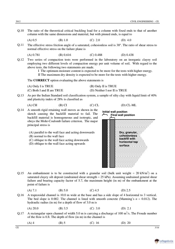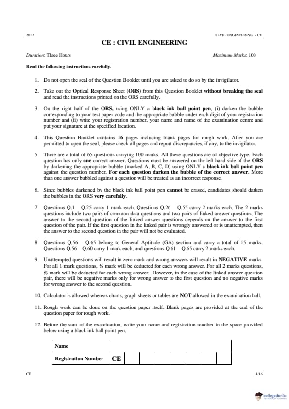 GATE 2012 Civil Engineering (CE) Question paper with Answer Key PDfs are now available for download. GATE 2012 CE was held on February 12, 2012 by IIT Delhi. The session of this paper was forenoon and in the offline medium. GATE 2012 CE Question Paper consists of two sections that are, General Aptitude for 15 marks and 85 marks are allotted to core subjects.