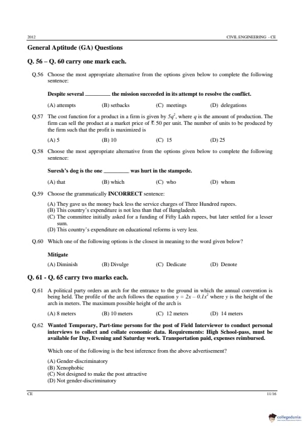 GATE 2012 CE question paper consisted of 65 questions in total. The paper got further broadened into two sections one is the core subject other is general aptitude.
