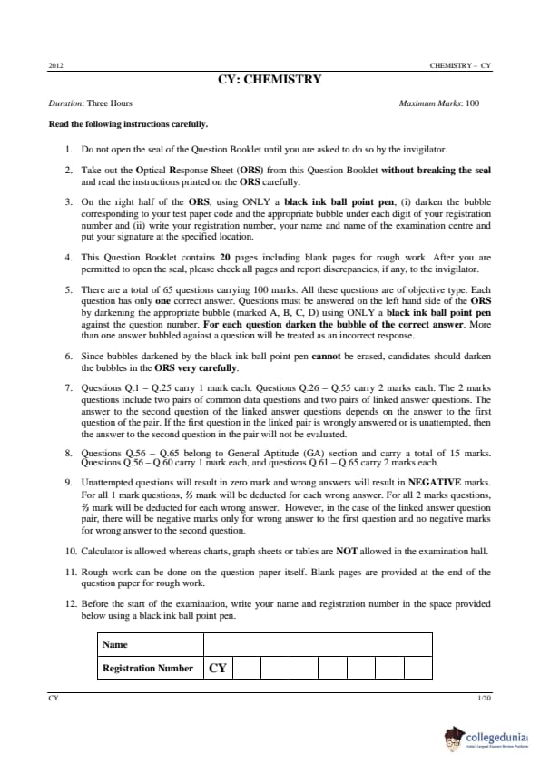 GATE 2012 Chemistry (CY) Question Paper with Answer Key PDFs are available for download. The exam was organized by IIT Delhi on February 12, 2012, in offline mode. GATE 2012 CY Paper consisted of 85% of the core subject, and the rest of 15% was taken by the general aptitude section. Candidates can now download the question paper along with its answer key from the links below provided.